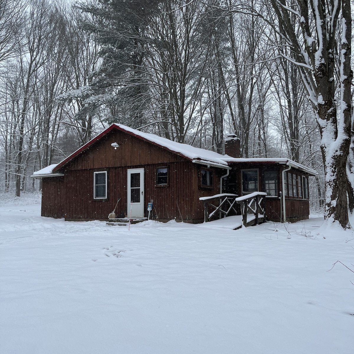 Take it easy at this unique and tranquil getaway in the small village of West Farmington. This 1050 sq. ft. cosy A-Frame allows you to relax and reset at this perfect getaway away from the city. Warm up in front of the retro fireplace - main furnace heats the cabin well. Fun vibes with the bridge walkway and the many small bohemian details. 5 min walk down a country road you’ll find your way to a peaceful lake that you’ll have access to fishing/kayaking/paddle boarding. Sauna/Hot tub are hot!