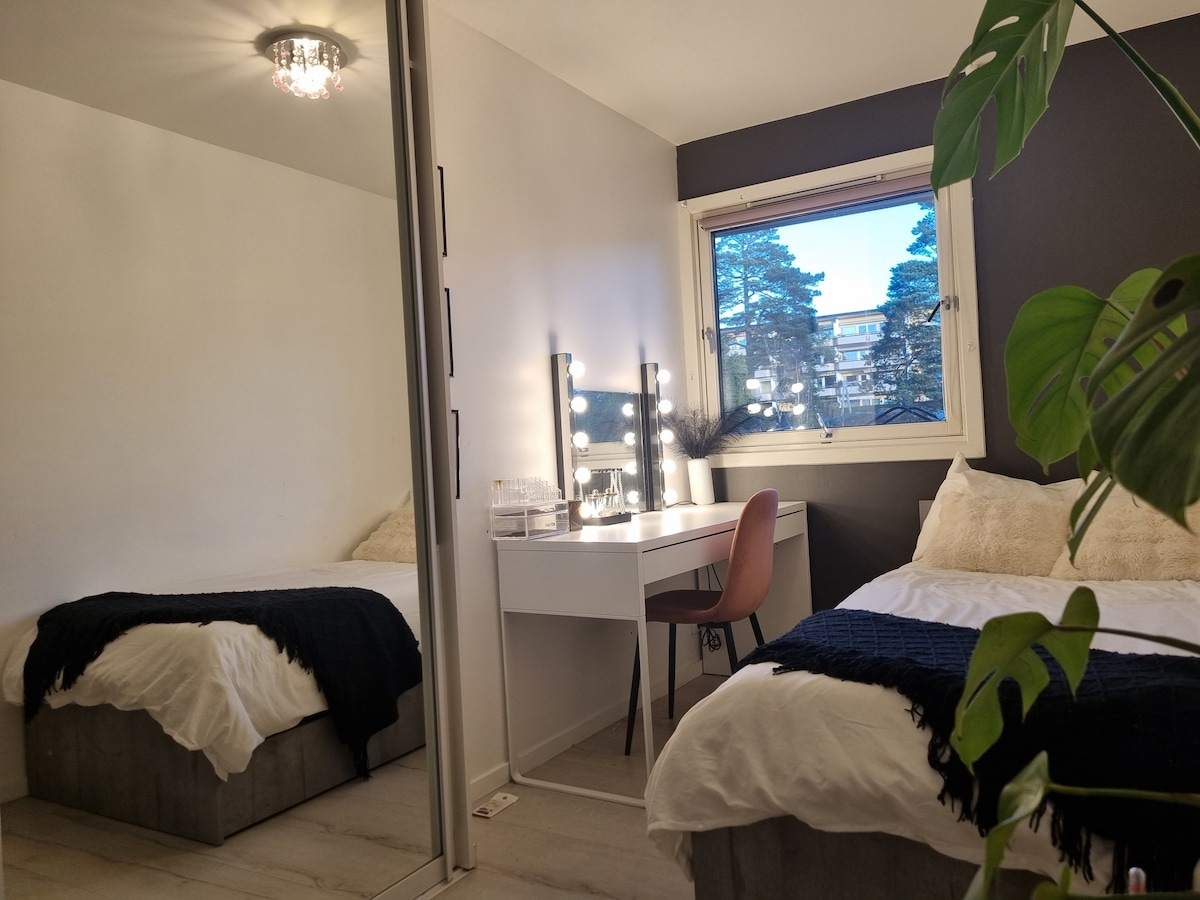 Heldige du: Her kan du bo midt i sentrum, med gangavstand til omtrent alt du måtte ønske, og samtidig rolig og fredelig. Her bor mange smilende og hyggelige pensjonister. Leiligheten er romslig for to, og det er mulighet for å sette frem en baby-/småbarnseng om ønskelig. Det er en fargerik leiligheten, full av sjel, perfekt for gjester om søker seg vekk fra energitappende hotellrom. Stor sørvest-vendt balkong. Gangavstand til Flybussen/Nesparken. Deilige mattilbud som Nobel, rett utenfor døren!