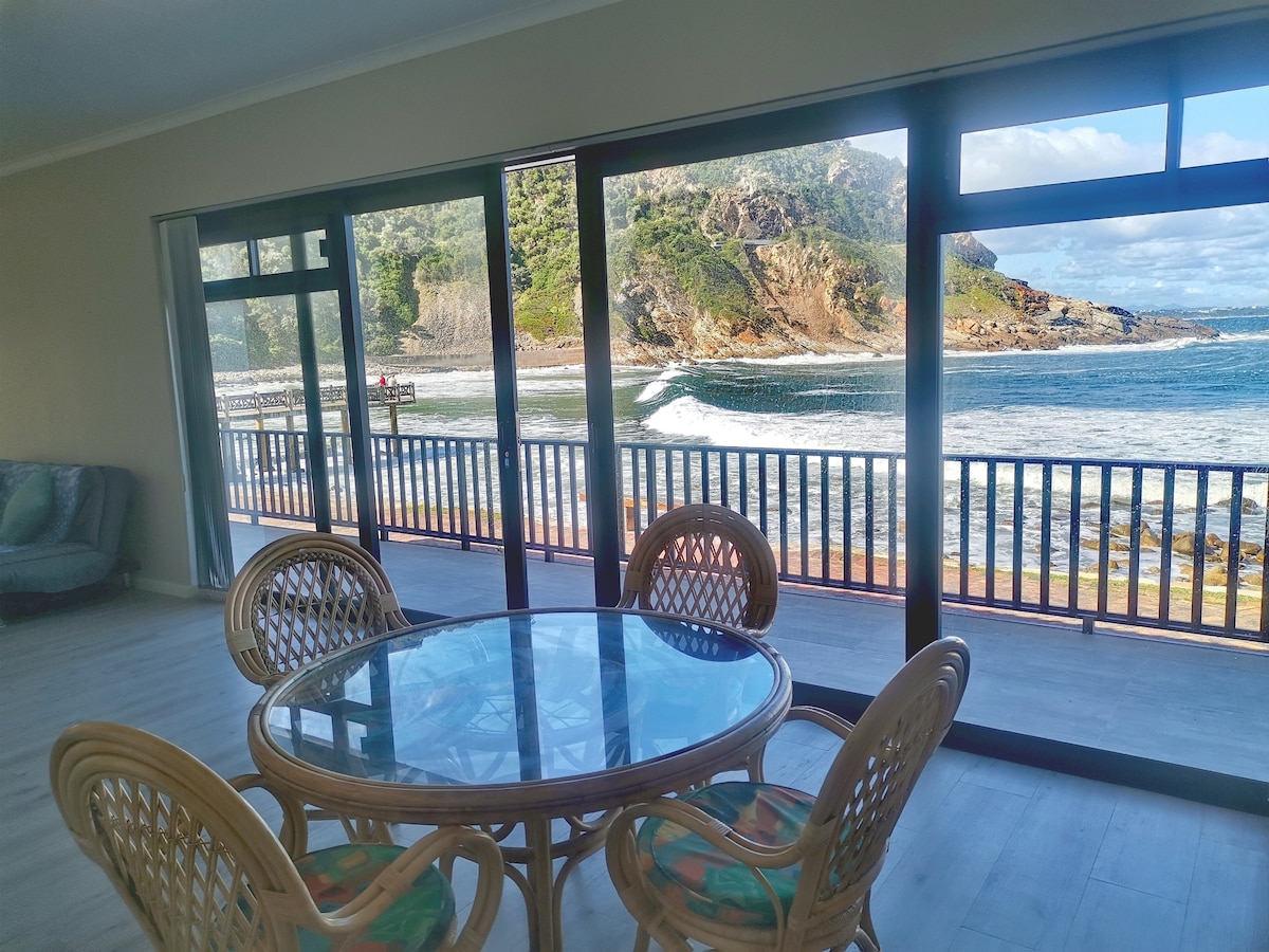 Seaside cottage is situated on Wilderness main beach. The cottage has no sea views from the bedrooms but only from the balcony upstairs. Beautiful sea views from the comman area on the grass. Walking distance to the Wilderness village. Ideal getaway for all couples and families. ( not ideal for small children, stairs in cottage and open balcony) No safety gate at stairs. The property is fully walled and has secure parking on the premises for one vehicle.