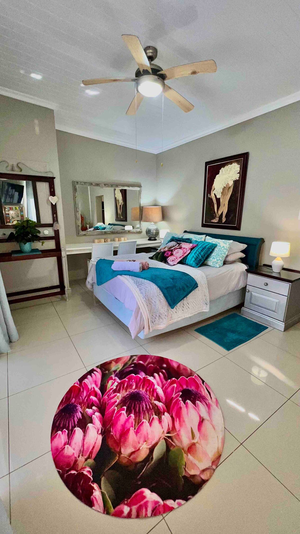 Welcome to Peace lily! Located in a tranquil and popular residential area of George, Peace Lily Suite offers a cozy and comfortable retreat for your stay. Enjoy a restful night on a comfortable queen-size mattress, complete with fresh linen and towels. Convenient Amenities: The room is equipped with a kettle, coffee, tea, sugar, microwave, and mini fridge. (portable braai facilities on request)The bathroom boasts a walk-in shower and a double vanity, offering a touch of luxury during your stay.