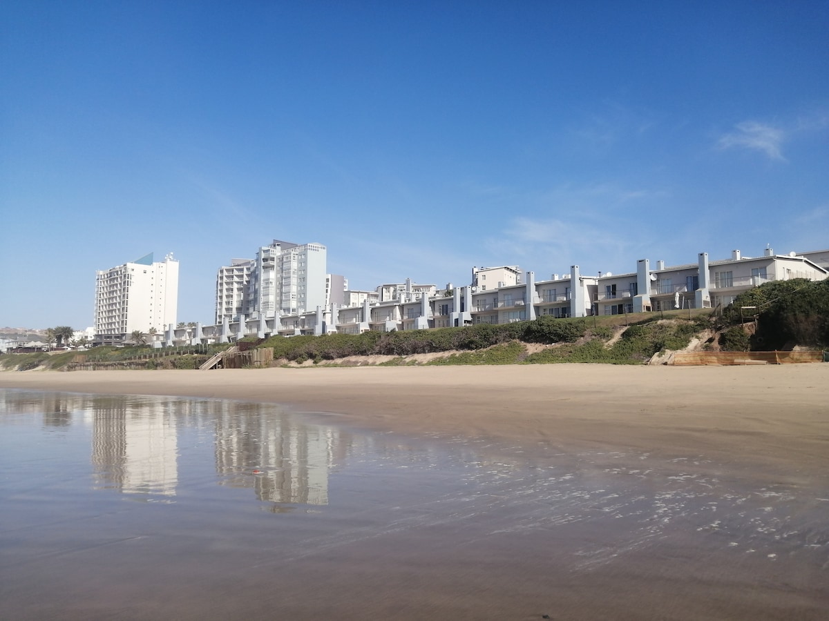 Sunset is a luxury and spacious self catering holiday condo- in Beach Club - beachfront with a 180 view! it is a 2 bedroom unit with each having a queen bed and a en suite bathroom.There is also 2 x sleeper couches available- Sleeps 6-8 Therefor 4 adults ( 2x couples) and 2 - 4 kids! Waterpark and swimming-pool! Including is : Free Wifi - and a smart tv- for your own streaming. Also a beach bar! Bring your own beach towels! ⛱️ We have bathroom towels- Come and enjoy!