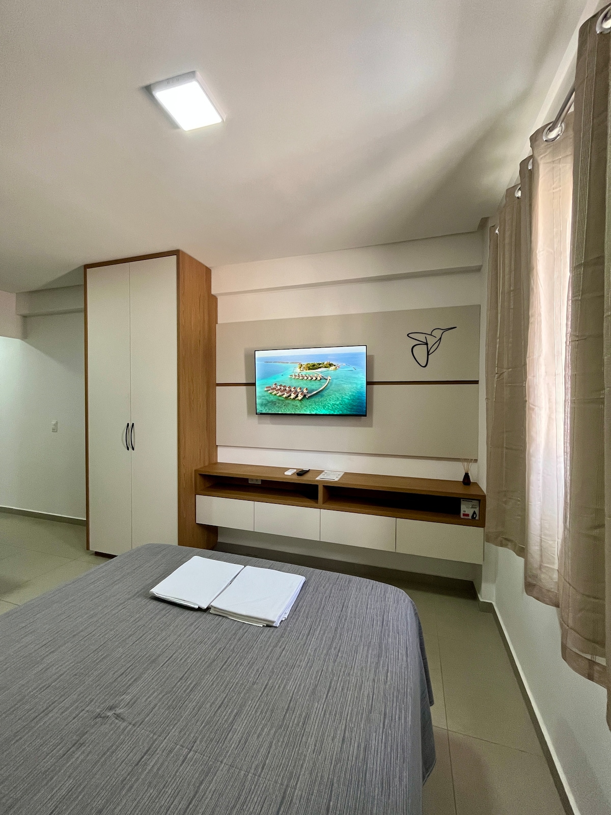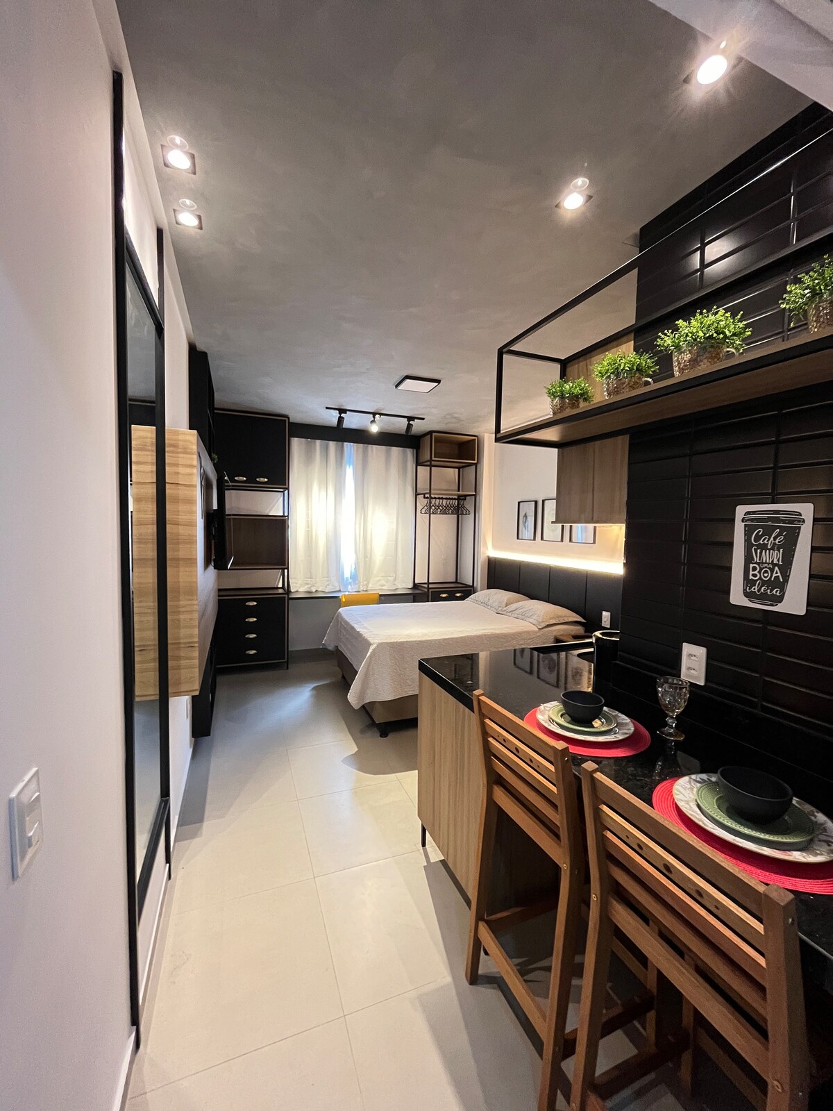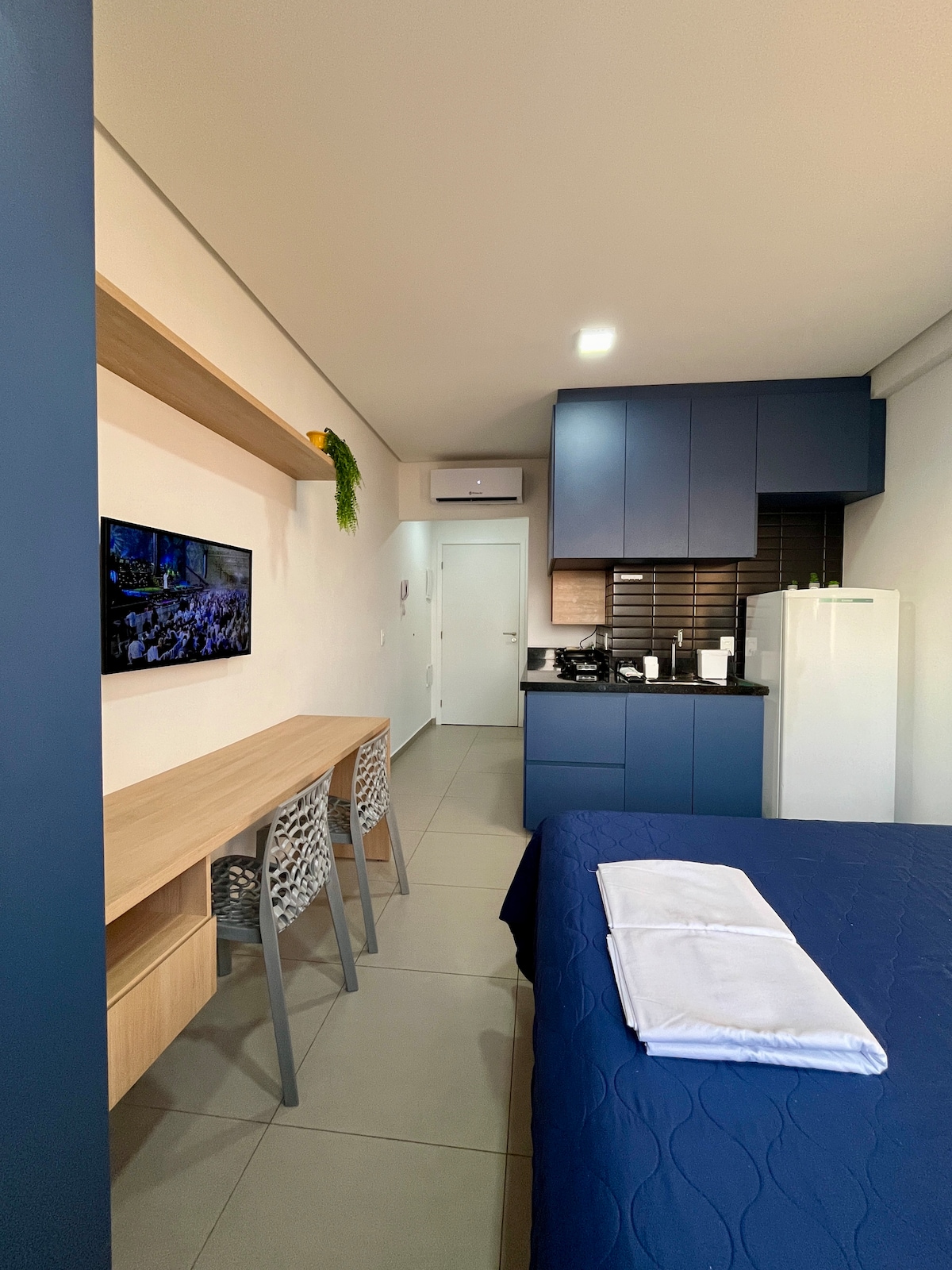 Seja bem-vindo ao seu novo lar temporário! Studio moderno e totalmente equipado, com localização privilegiada, no bairro mais nobre da cidade – com tudo o que você precisa a poucos passos de distância: bares, restaurantes, supermercados e o principal shopping da região. 🛏 Acomodação inteligente e estilosa, pensada para oferecer conforto e praticidade em cada detalhe. A decoração minimalista cria um ambiente aconchegante e elegante, ideal para quem busca uma estadia tranquila e funcional.