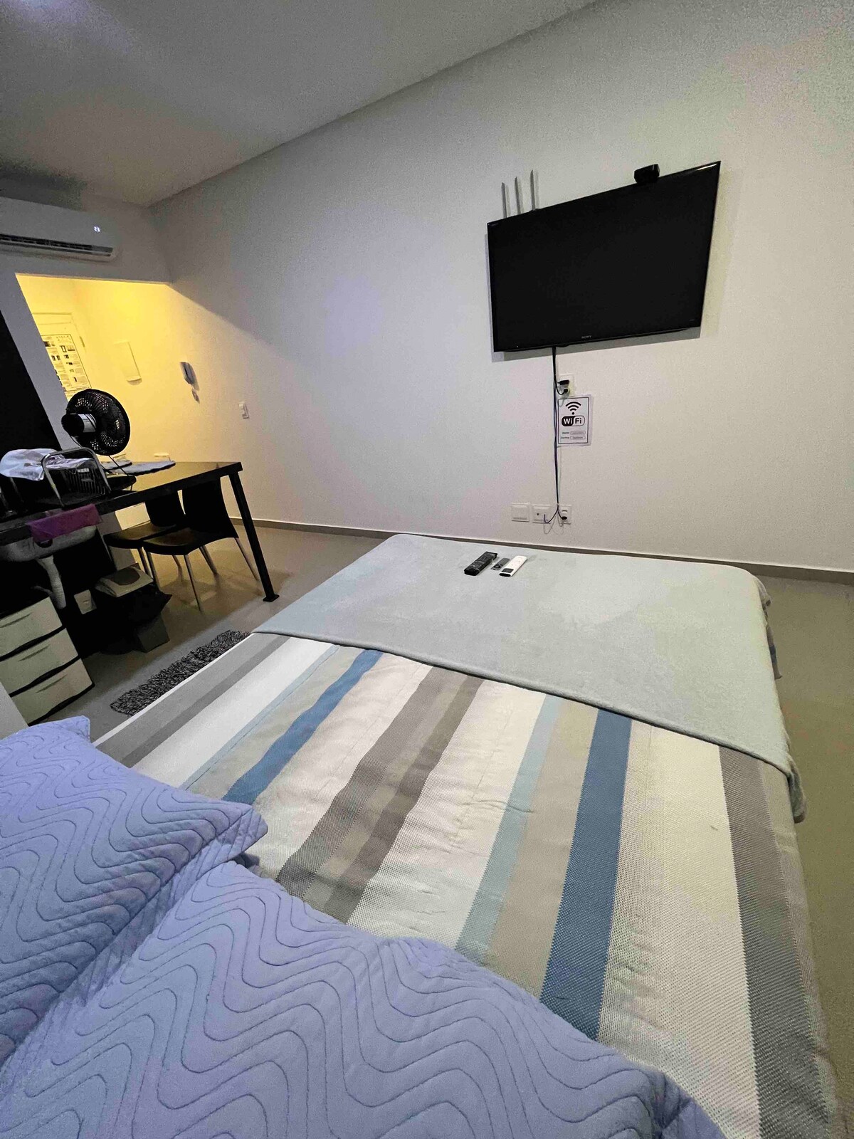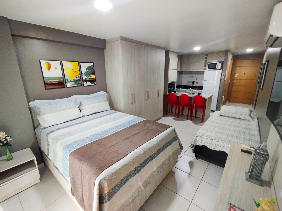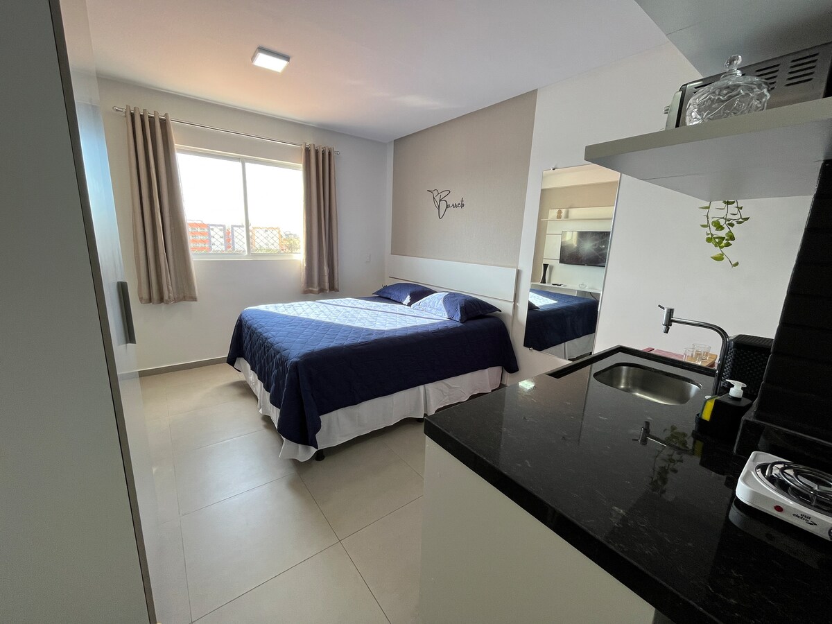 Seja bem-vindo ao seu novo lar temporário! Studio moderno e totalmente equipado, com localização privilegiada, no bairro mais nobre da cidade – com tudo o que você precisa a poucos passos de distância: bares, restaurantes, supermercados e o principal shopping da região. 🛏 Acomodação inteligente e estilosa, pensada para oferecer conforto e praticidade em cada detalhe. A decoração minimalista cria um ambiente aconchegante e elegante, ideal para quem busca uma estadia tranquila e funcional.