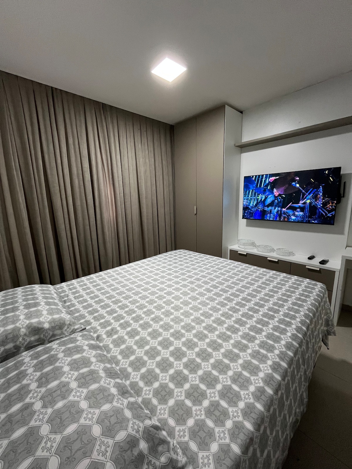 Apartamento com alto padrão composto de: 1o. Quarto - 1 cama Queen com TV e central de ar 2o. Quarto - 1 Cama Queen com central de ar 3o. Quarto - 1 Cama Casal com ventilador Apartamento com todos os utensílios de cozinha para uma estadia de curta ou longa temporada. Condomínio espaçoso com Espaço Kids, Piscina Coberta, Academia, Salão de Festas, Redário e Churrasqueira para tornar sua estadia bem agradável.