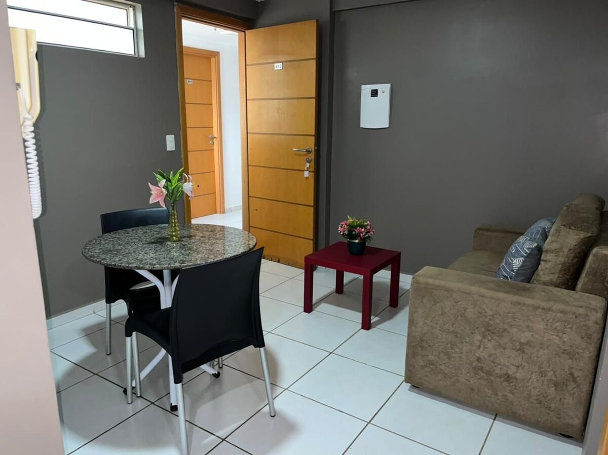 Apartamento confortável, mobiliado e equipado em bairro nobre de Mossoró próximo ao principal shopping da cidade, restaurantes, farmácias, universidades e postos de combustível. O espaço dispõe de 1 suíte climatizada com smart TV e cama de casal, 1 sala com ventilador, sofá-cama e TV, cozinha completa de utensílios e gelágua. O prédio dispõe de portaria 24 horas, estacionamento, piscina, academia, restaurante e sauna. Anfitrião: @raul2n