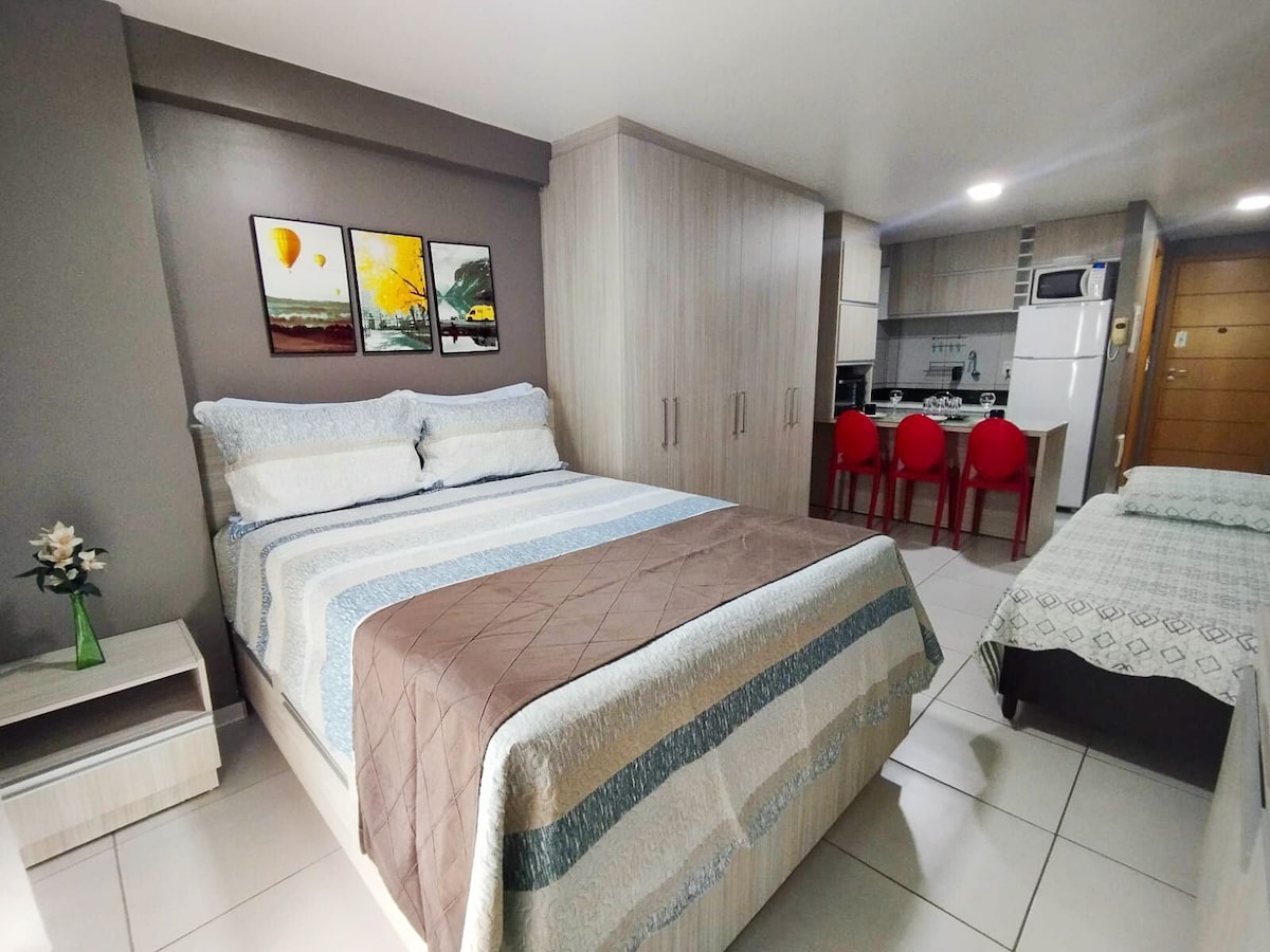 Seja bem-vindo ao seu novo lar temporário! Studio moderno e totalmente equipado, com localização privilegiada, no bairro mais nobre da cidade – com tudo o que você precisa a poucos passos de distância: bares, restaurantes, supermercados e o principal shopping da região. 🛏 Acomodação inteligente e estilosa, pensada para oferecer conforto e praticidade em cada detalhe. A decoração minimalista cria um ambiente aconchegante e elegante, ideal para quem busca uma estadia tranquila e funcional.