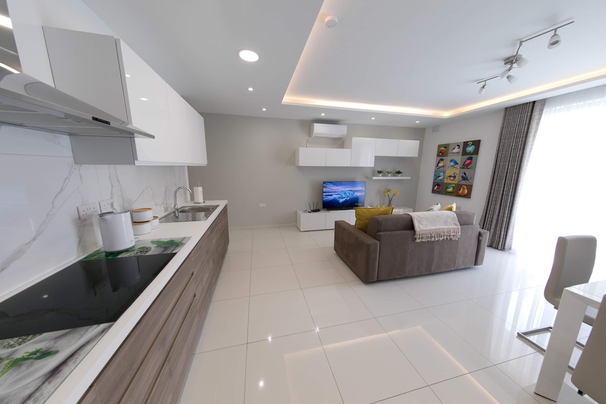 Orion Court Flat 4D , A nice romantic getaway to Malta. A stunning brand new one bedroom apartment, fully equipped. Fully air conditioning and washing machine. Fully equipped kitchen with dishwasher, microwave and coffee machine. A sensational living room with 50"Android Tv with access to multiple channels, streaming apps and wifi included. It has a lovely balcony with armchairs and a table.