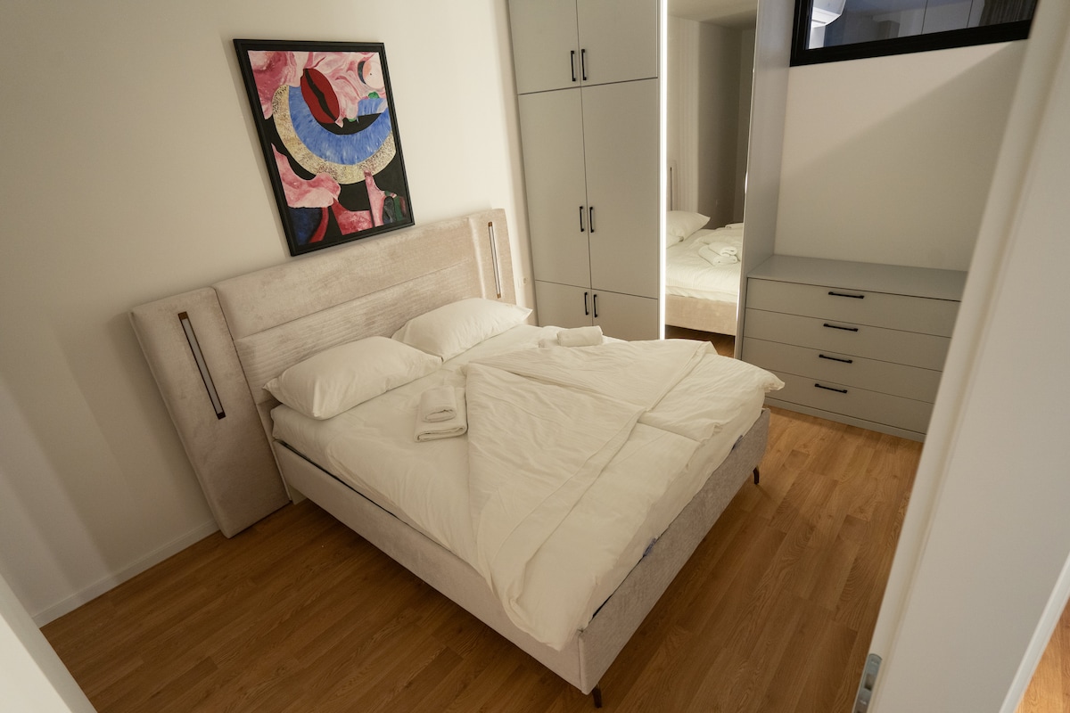 Enjoy a stylish experience at this centrally-located place in brand new building.The apartment consists of a bright bedroom with a comfy king-sized bed, dinning table for 4 persons and modern fully equipped kitchen. A sunlit living room with Smart TV. The pull-out corner in the living room can also serve as an additional bed for 2 more guests. The entire apartment was designed by architect (Adil Glavovic - axisarchiteture)