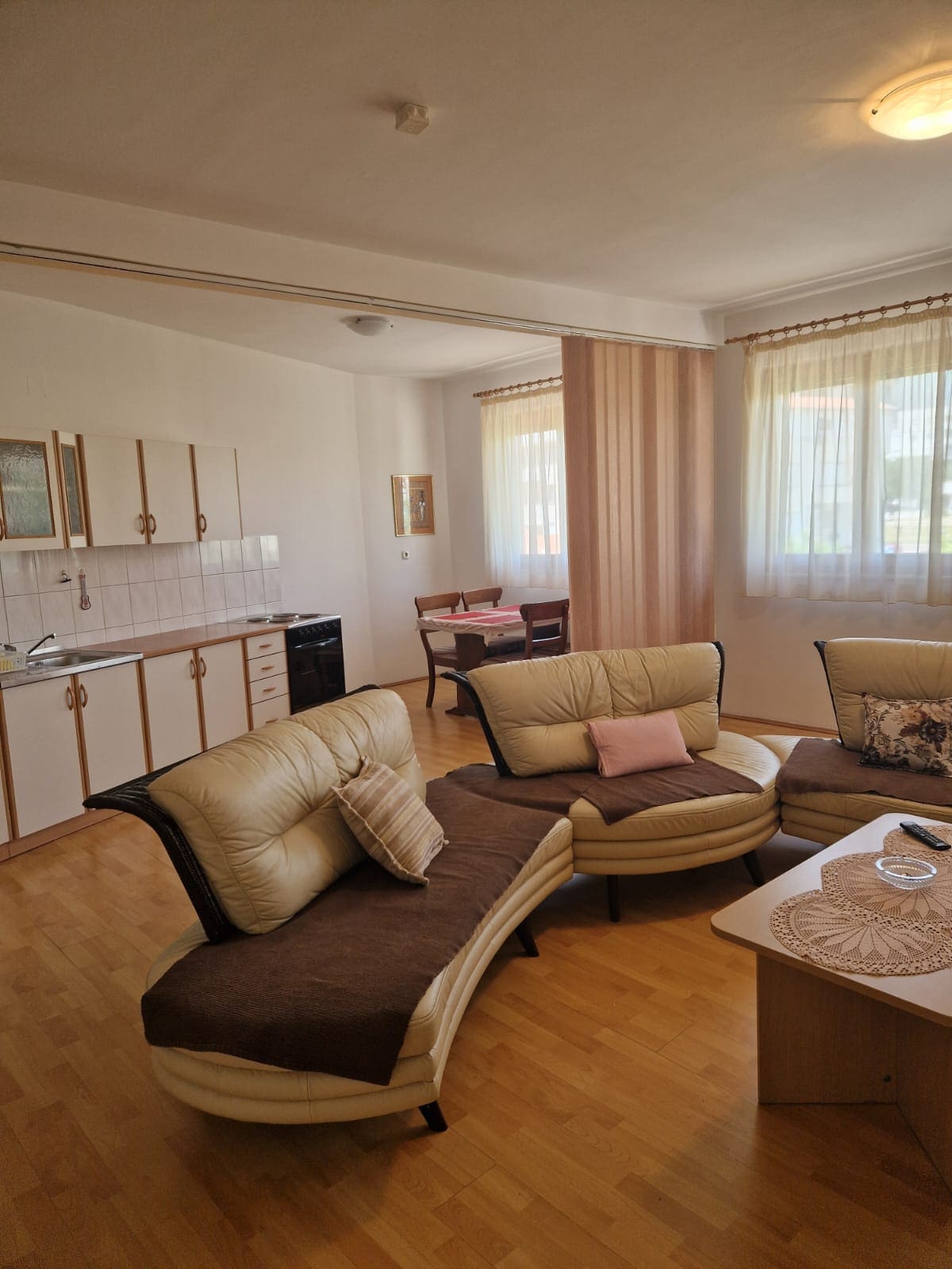 River and mountain view apartment Three sleeping bedrooms, including living room, dinning room , kitchen and two balconies. Private entrance and air condition in all rooms. Apartment has 130 m2 and two bathrooms. Suitable for families and groups We have got free parking places, washingmachines, dishwashers, fast wifi, airconitioned space, space for rest or work, huge garden with fireplace for barbecue The accommodation facility is located near the Old Bridge and the famous music center Pavarotti
