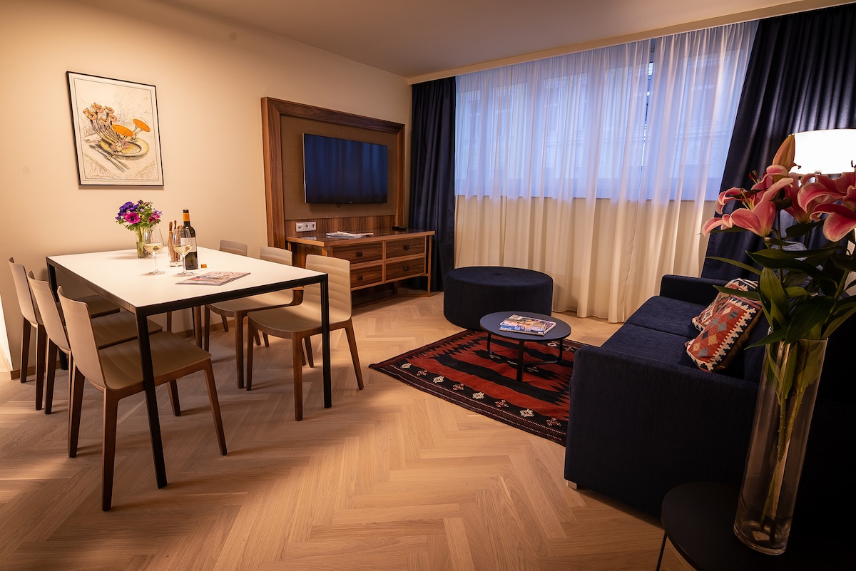 This comfortable apartment with terrace offers 45 m² of space for up to 2 people. The bedroom with double bed (180x200), the living room with smart TV and dining table and the modern bathroom with shower make this stay a perfect way to experience Vienna. The room also offers a fully equipped kitchen with sustainable coffee and tea facilities and a washing machine. Here you’ll have everything you need for maximum comfort and minimal stress.