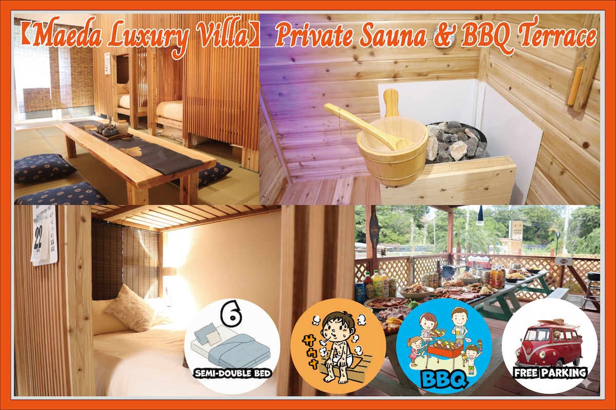テラスでサウナとBBQとジャグジー付き・最大16名・築浅おしゃれな貸別荘