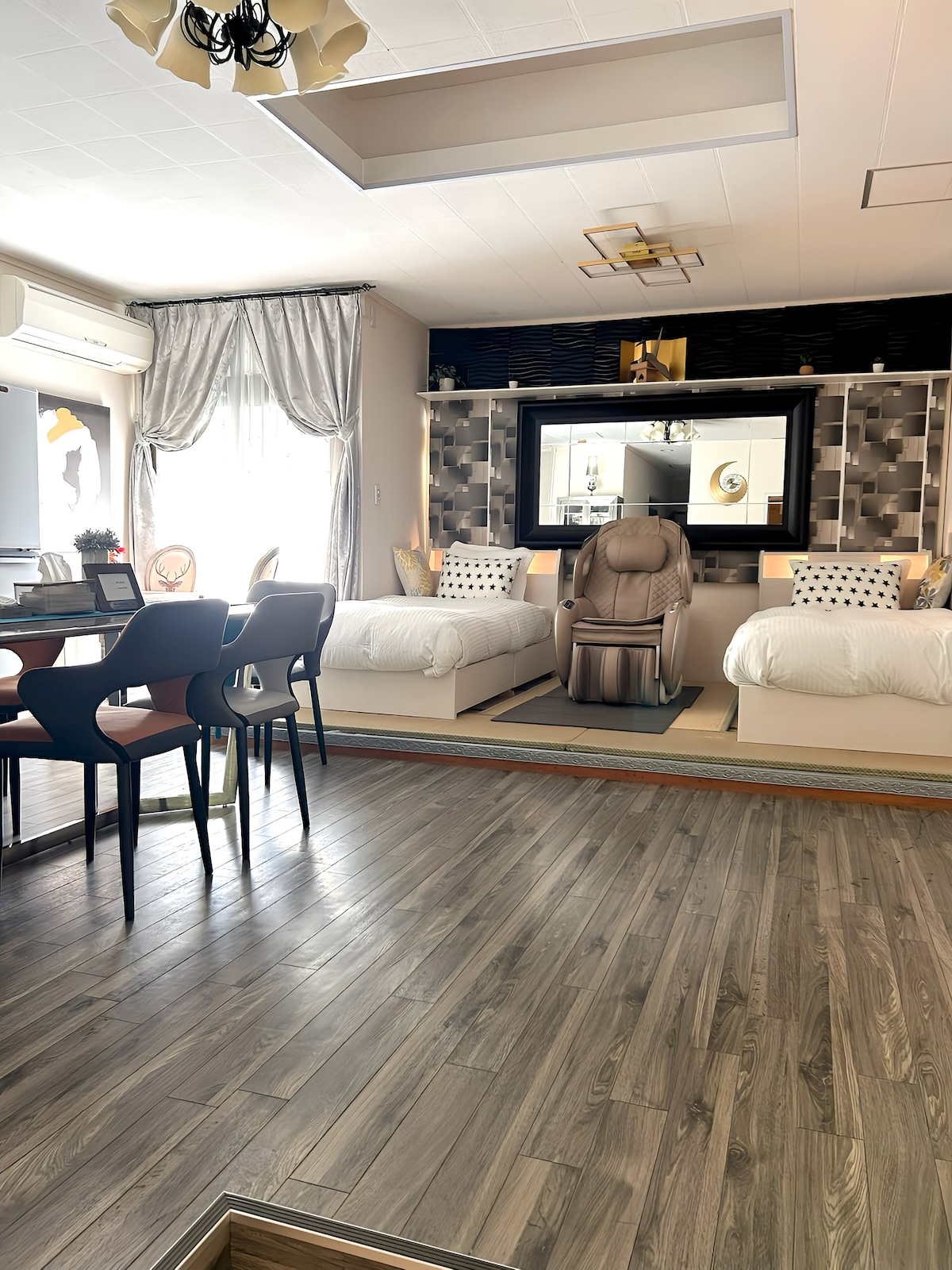 \開業1周年キャンペーン!/ 期間限定・特別価格でご案内中! お得なこの機会にぜひヴィラでゆったりステイを。 \新築・1棟貸切ヴィラ/ 2024年12月 GRAND OPEN「MIRATIO Saphir(サフィール)」は、デザインヴィラ。 室内のアートが空間に彩りを与え、感性を心地よく刺激するひとときを演出します。 周りを気にせず過ごせる一棟貸切スタイルで、最大12名様まで宿泊OK。ご家族やグループでのご利用に最適です。 【全天候型、遊びのフルコース】 アウターリビングにはBBQコンロをご用意。さらにプライベートジャグジー&ロウリュウサウナを完備! 雨の日でも任天堂SwitchやNetflixでゆったり楽しめます。 【旬の彩りを味わう】 充実したキッチンアメニティで、暑い夏はお子さまも喜ぶかき氷、寒い冬は室内でしゃぶしゃぶや鍋パーティーも◎ 【歩いて出会う癒しの景色】 ビーチまで徒歩約10分。季節の自然や海と山の絶景が、歩く時間さえも贅沢に彩ります。