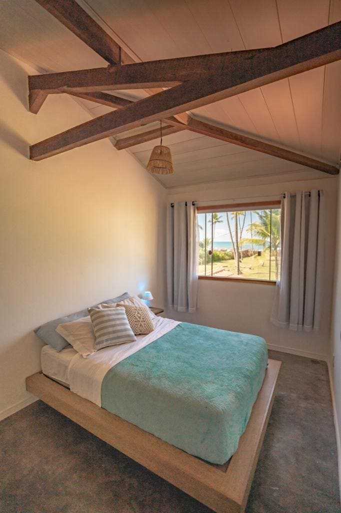 With direct access to the beach and air conditioner, this bangalo is a sophisticated version of a typical vernacular house usually seen in the country side of the tropical state of Bahia. Its improvements includes wide class doors, white floors and integrated cupboards and wardrobes. From the bed you can see the beach and sea beyond. The tropical garden hugs the house and supports the wild life of many birds' species. The wide unspoiled beach is just a few steps away, a very peaceful place.