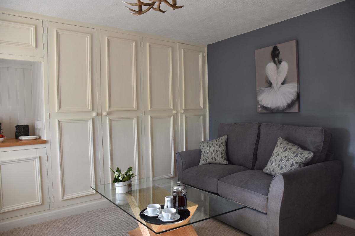The flat is attached to our house above the garage with own front door, large space with a king sized John Lewis bed & own bathroom. Built in 2016 so nice and warm. The kitchen has fridge,freezer,microwave, kettle,toaster, washer, oven & hob Sky Tv with sports,Disney,Netflix, Wi-Fi300mb+. desk. If booked 2 days in advance we provide cereal,bread, butter,milk,tea& coffee. Parking is private and located next to the entrance door,EV charging available. USB charging sockets.