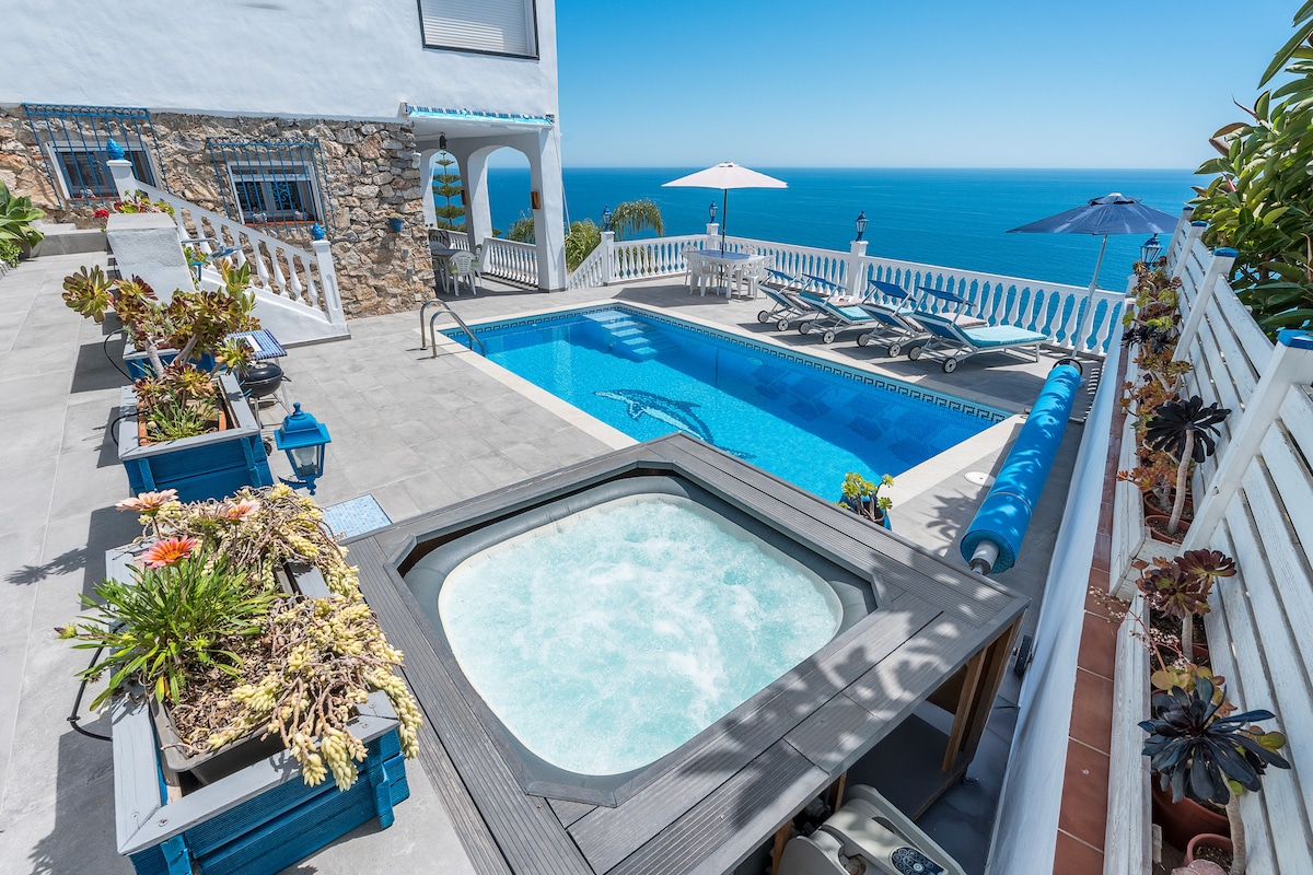 Experience the quintessential coastal getaway in this luminous Andalusian style villa, where every room is a window to the breathtaking 180º vistas of the Mediterranean. Enjoy the sunshine all day! The 3-bedroom house has a private salt water pool with optional heating and terraces with views all around. Enjoy the fully equipped kitchen, bright living area & stylish furniture. Garage and wifi available. Enjoy this beachfront airbnb year-round!