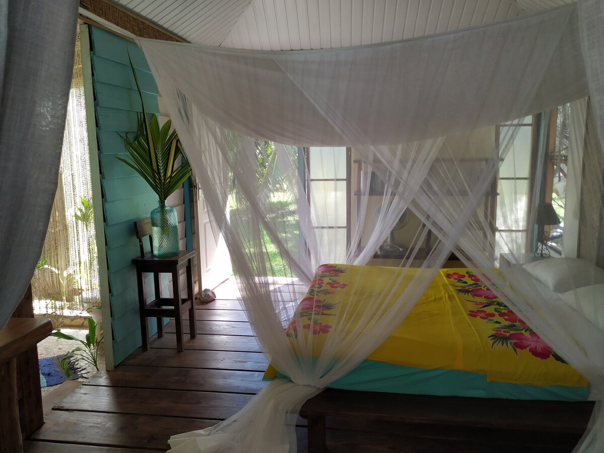 Bungalow Bali Hai is ideally located on a private road just 200 meters from one of Huahine's best beaches and just a 10 minute walk from main town Fare. The bungalow features a queen bed, fully equipped kitchen, outdoor shower, ceiling fans, screened windows and doors. In a tropical garden setting, guests can enjoy a meal at the dining table, relax in the hammock, or practice yoga on the deck in privacy; the grounds are completely fenced. Free wifi, bikes and airport pick up!