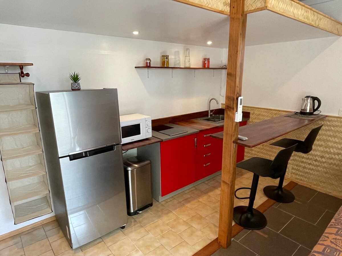 Located in Fare, this detached holiday studio is a few steps from the nicest white sand beach of the island, restaurants and shops. It is fully equipped : Flat screen TV, wifi, oven, microwave, fridge, A/C. There is a private bathroom with a shower. Towels and bed linen are featured. There's mosquito's screen at the windows and gate. Huahine Airport is 2km from the Fare Chili.