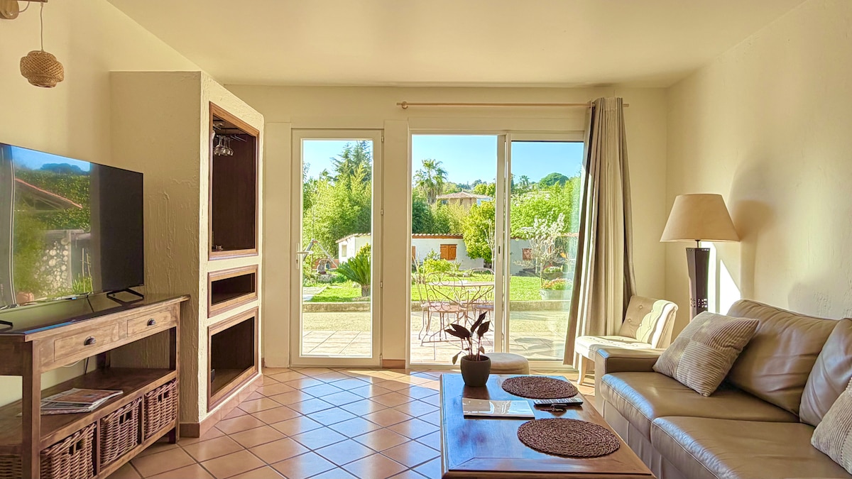 Villa 5★ avec jacuzzi privé à Mougins, proche Cannes et plages. Maison entière pour 4 personnes, au calme, jardin avec oliviers centenaire, espace extérieur aménagé, barbecue et climatisation réversible. Chambre avec lit king-size 200x200 et lit confortable dans le salon .Idéale pour vacances, télétravail ou Festival de Cannes. Quartier résidentiel sécurisé. Animaux calmes acceptés. Événements non autorisés. Parking privé pour plusieurs voiture .