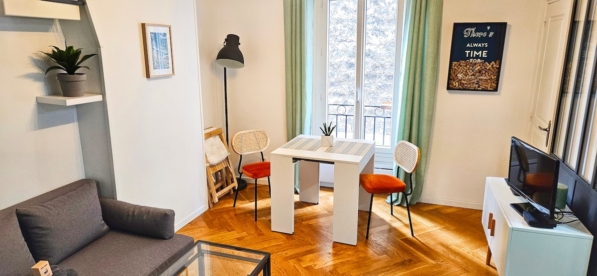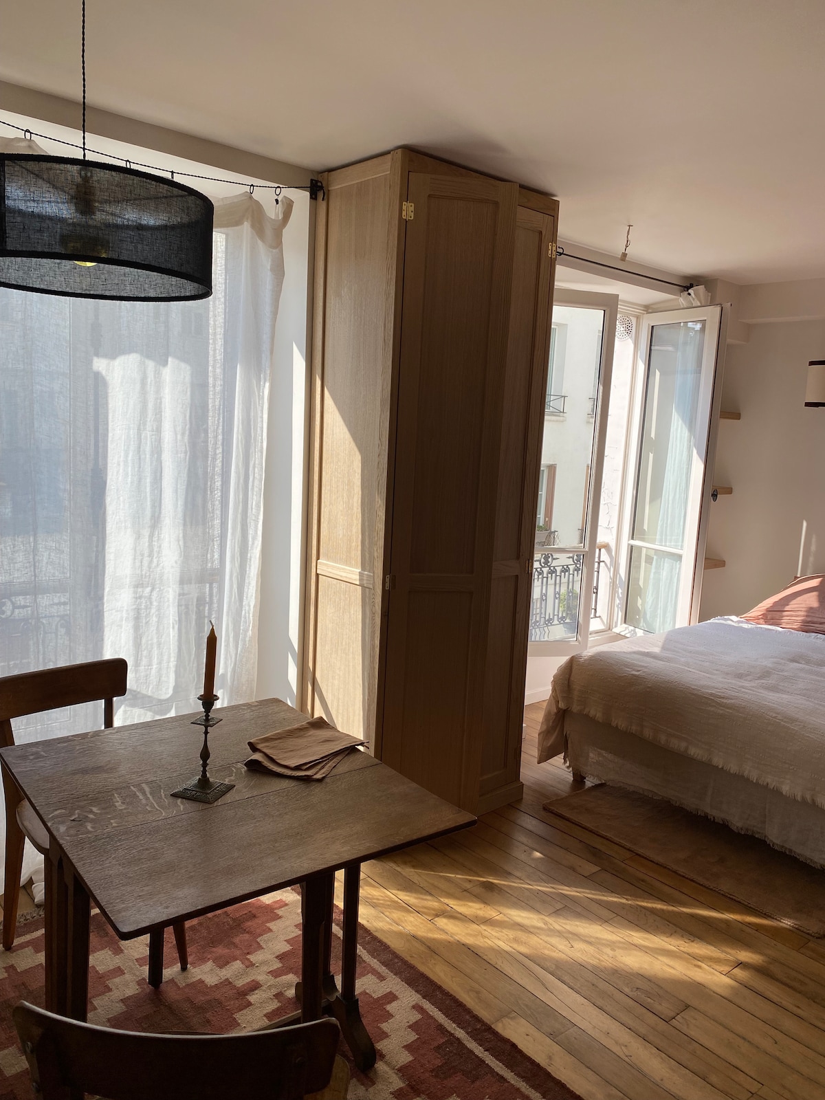This charming ground-floor one-bedroom apartment overlooks the Cité Véron and is full of character. It features a living room, a dining or work area, a beautifully designed and fully equipped open kitchen, a bedroom with a closet, and a shower room with toilet. The bedrooms in this category do not face the outside but are exceptionally quiet. Some apartments in this category are also accessible for guests with reduced mobility.