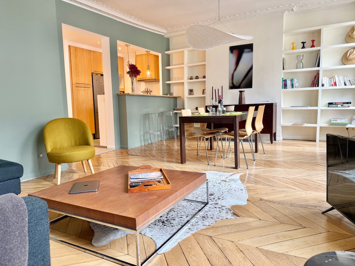 54 m² duplex apartment in the heart of Abbesses, Montmartre. Perfect for couples, friends or business travelers. On the 1st floor, day area with entrance, separate toilet, large living room with sofa bed, dining area and equipped kitchen. On the second floor, a double bedroom, bathroom with Italian shower, balneotherapy, double washbasin and toilet. The apartment is equipped with a washing machine, Nespresso machine, high-speed Wi-Fi connection and many other amenities for your comfort.