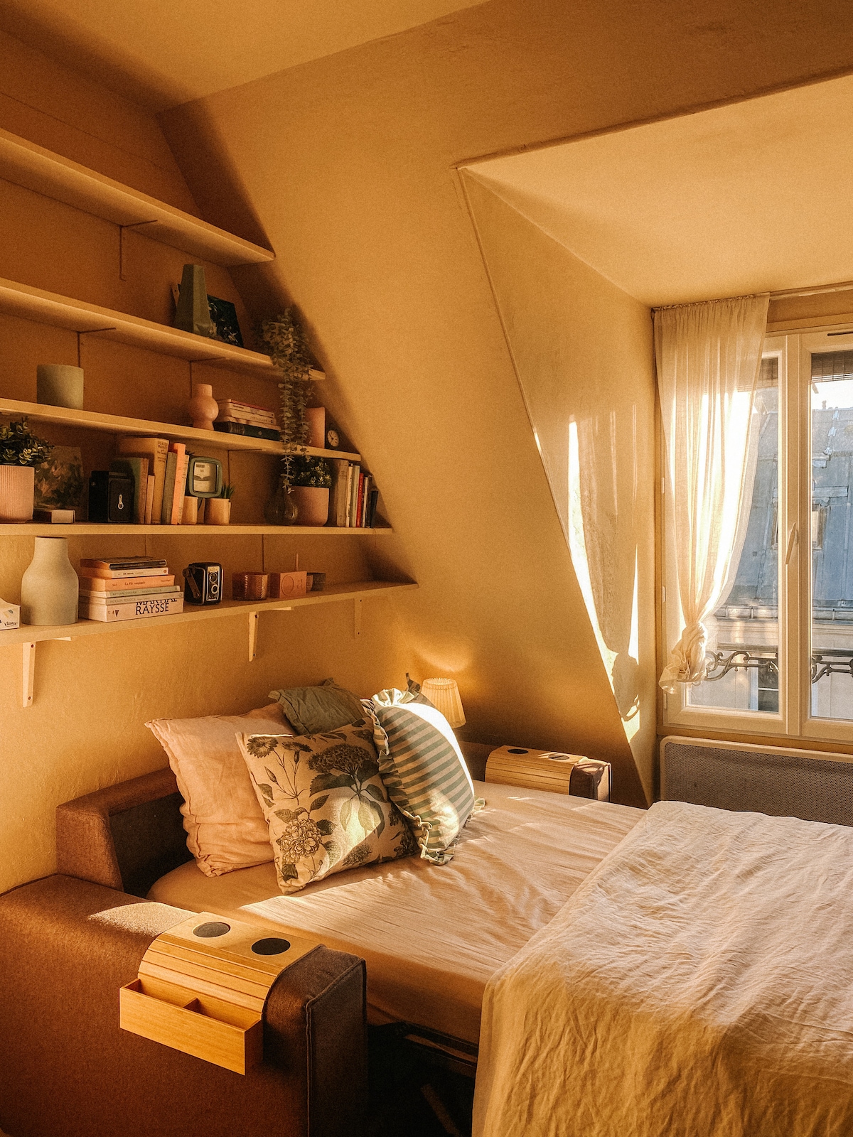 petit appartment de 35 m2 (dont 9m2 en mezzanine) au coeur des abbesses Possibilité de louer une place de parking sécurisée 1 coin chambre en mezzanine dure accessible par un petit escalier type échelle. (hauteur 150 cms) Lit 140 Je suis flexible pour les horaires d’arrivée. Little Apartment in the abbesses a bedroom area with hard mezzanine accessible by a small ladder type staircase (height 150 cm except under the skylight) Bed 140 cm bathroom with we flexible for arrival / departure