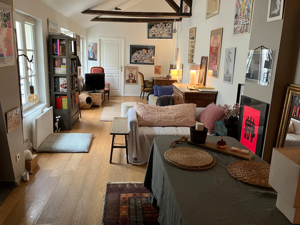 Charmant studio avec vue imprenable sur Paris ! Caractéristiques principales : Plafonds avec poutres apparentes pour une ambiance authentique et chaleureuse Un lit double confortable pour des nuits reposantes Un coin bureau cosy, parfait pour travailler ou se détendre avec un bon livre Espace de vie : Détendez-vous dans un espace lumineux et accueillant, baigné de lumière naturelle grâce aux grandes fenêtres qui offrent une vue imprenable sur les toits de Paris.