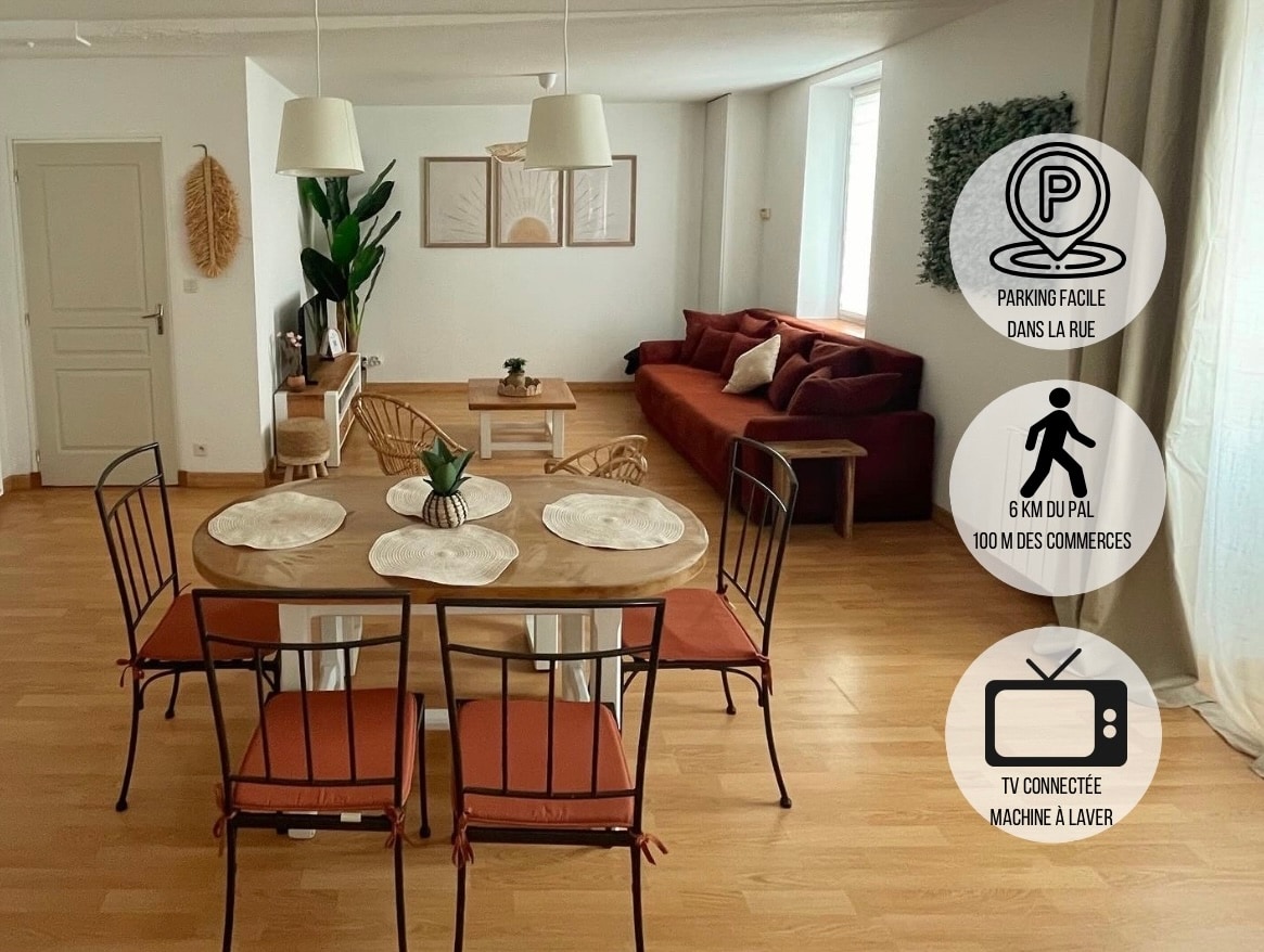 Appartement 1er étage climatisé au cœur du centre ville - à 2min à pieds restaurants, bars, marché, épiceries... - à 5min à pieds Maison Mantin, Musée Anne de Beaujeu, Mal Coiffée, Cathédrale... - à 10min à pieds gare SNCF, Musée du Costume de Scène - à 20min du PAL - Salon : tv connectée (YouTube, Netflix) - Cuisine équipée - Chambre : Lit 160x200 tv connectée - SDB : Douche jets massants, machine à laver