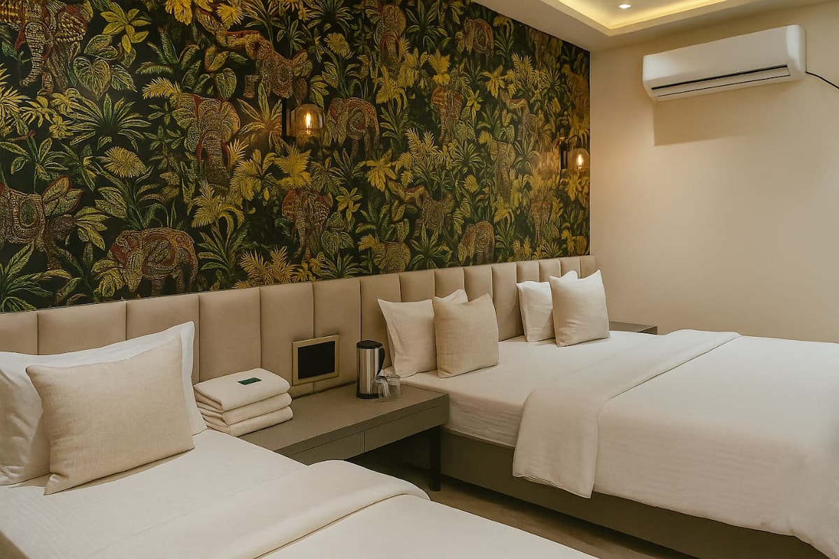 Colonel’s Villa, Abu Road — Nestled at the foothills of Mount Abu, this spacious 4-bedroom villa offers a peaceful retreat for families and friends. The villa follows a pure-vegetarian, alcohol-free policy, creating a calm and wholesome atmosphere ideal for Jain and vegetarian families. Enjoy quality time with loved ones amid serene surroundings, a private garden for kids to play with a fully equipped kitchen. Perfect for relaxation, laughter, and unforgettable evenings under the Abu sky.