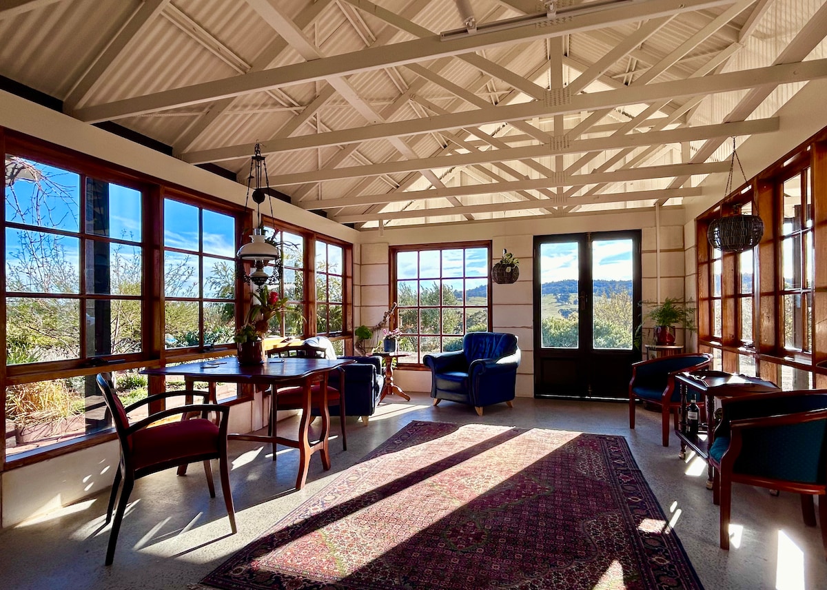 Situated on the highest hill in town, be&be boasts magnificent three-hundred-and-sixty-degree-views over town and country. The Elizabethan style house and studio are heritage listed and sit in an acre of garden, providing the perfect setting for a remarkable country experience, only a short walk to town. Treat yourself and book a stay, the encounter will linger long after you return home.