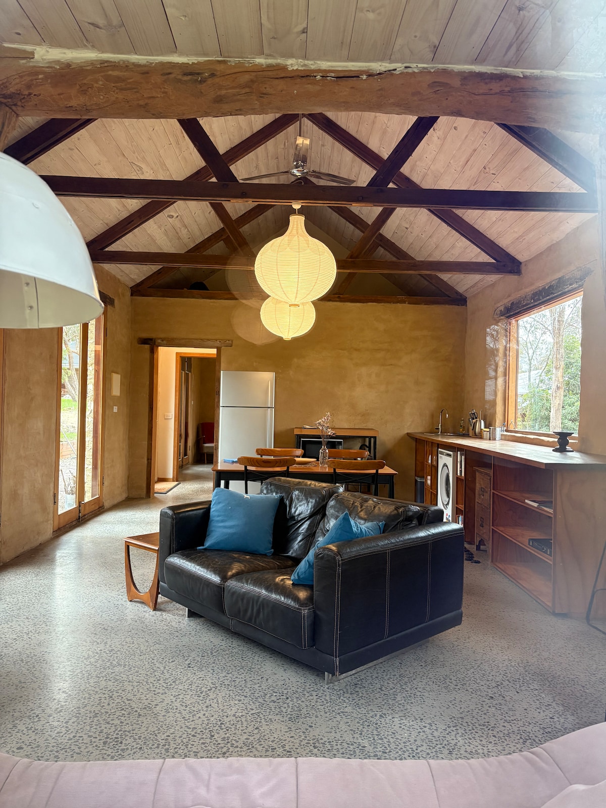 Kick back & relax in this calm, stylish, peaceful space in a bush setting 4kms from Castlemaine. The Mudhouse is back after a 5 year break. Offering the perfect get away for couples or a small family. There is a queen size bed and a double fold down couch which can be made up for two people to share. Renowned for its easy location to thriving Castlemaine, The Mudhouse boasts comfort, luxury and is equipped with all you need for a comfortable stay. EV charging maybe available on request