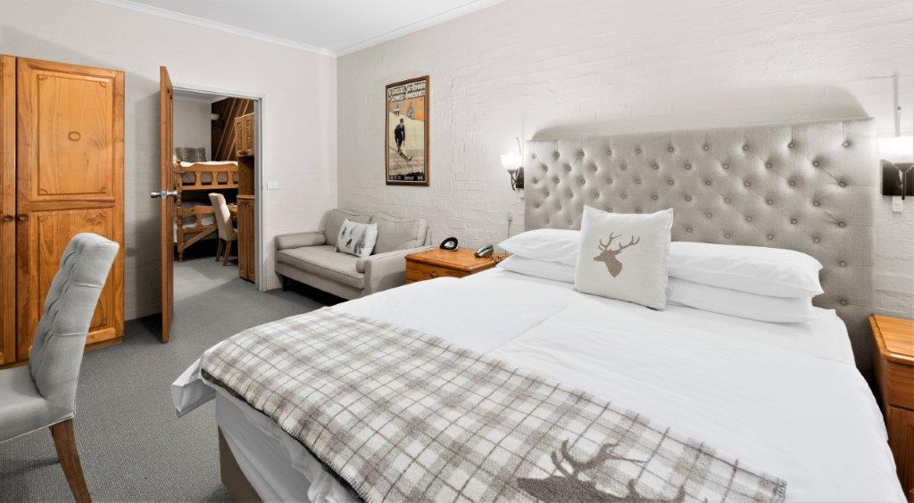 Family Quad rooms are larger style hotel rooms accommodating a maximum of 4 persons. The bunk is situated in the entry room whilst the king bed is in the main room. This room does not have a view. After a day on the slopes, retreat to your room, where rich timber accents, plush furnishings, and soft ambient lighting create a cosy, gemütlich atmosphere. BEDDING 1 x king bed and one bunk OR by request: 2 single beds and one bunk RATES Room rates include full buffet breakfast for each guest.