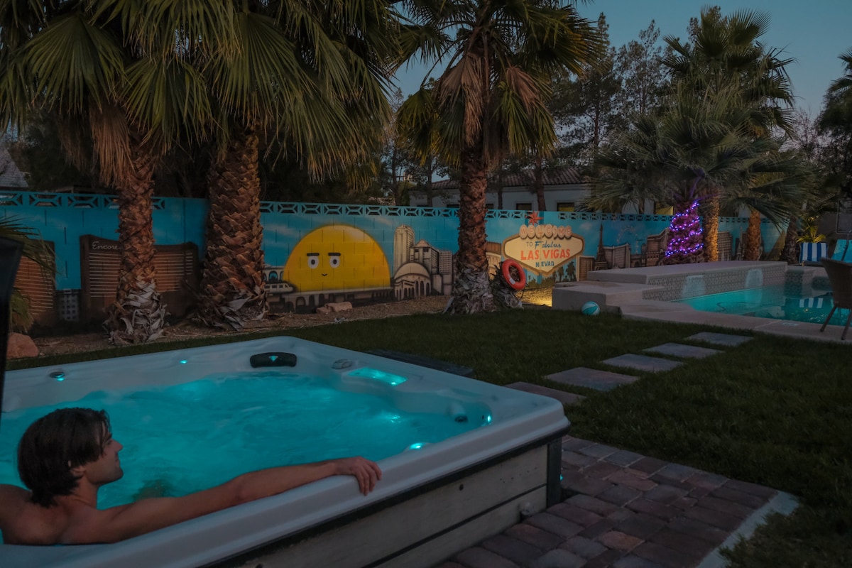 RARE on the market! This absolutely Stunning, fully remodeled Artsy home with a POOL, BUSINESS CENTER, CHEF KITCHEN is in the heart of historic DOWNTOWN-just 5 min drive to Las Vegas Strip, 10 min to Convention Center and 3 min to Fremont Experience. Nestled in a peaceful neighborhood this exquisite retreat is ideal for guests seeking luxury, comfort, and fun all in one place. Thoughtfully designed and beautifully equipped, this home meets all your family, business, and leisure needs.