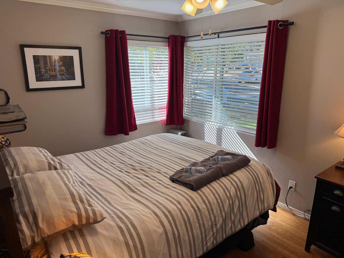 Charming Studio with Private entrance, Walk-in closet & an Exclusive bathroom. Wakeup to the peaceful view of the open hill and birds chirping. Located in a quiet family neighborhood. Convenient distance to public transportation, eateries, and supermarket. Self-checkin/out with digital keypad at your convenience. No loose keys. Home features a comfortable queen size bed with 2 firm pillows, 2 plush pillows, comforter and clean linens. Work station/office desk.
