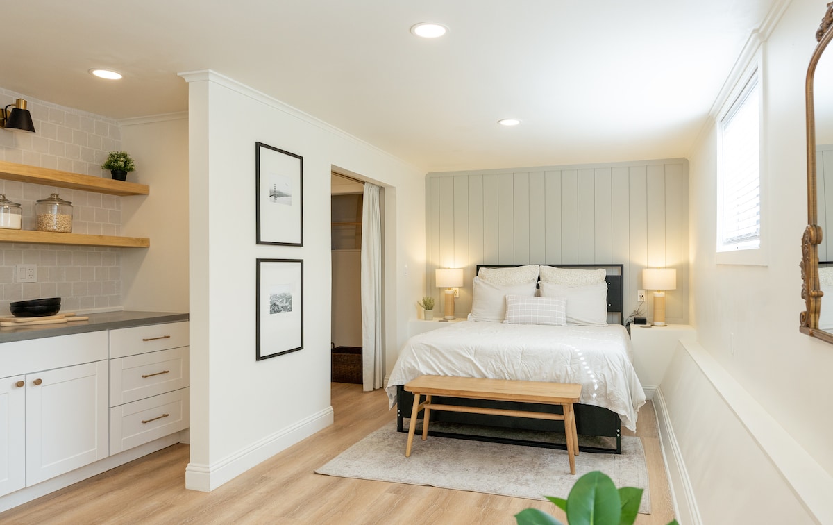 If you're searching for one of the premier Airbnbs in Walnut Creek, your search ends here! From the moment you arrive, you'll notice the attention to detail and exceptional value of this 2-bedroom, 1-bathroom home. It comes fully equipped for a first class experience. What truly sets this guesthouse apart is the wrap-around covered porch, featuring three ceiling fans, accent lighting, a gas BBQ, a fire table, a dining table adorned with a chandelier, as well as rocking and Adirondack chairs.