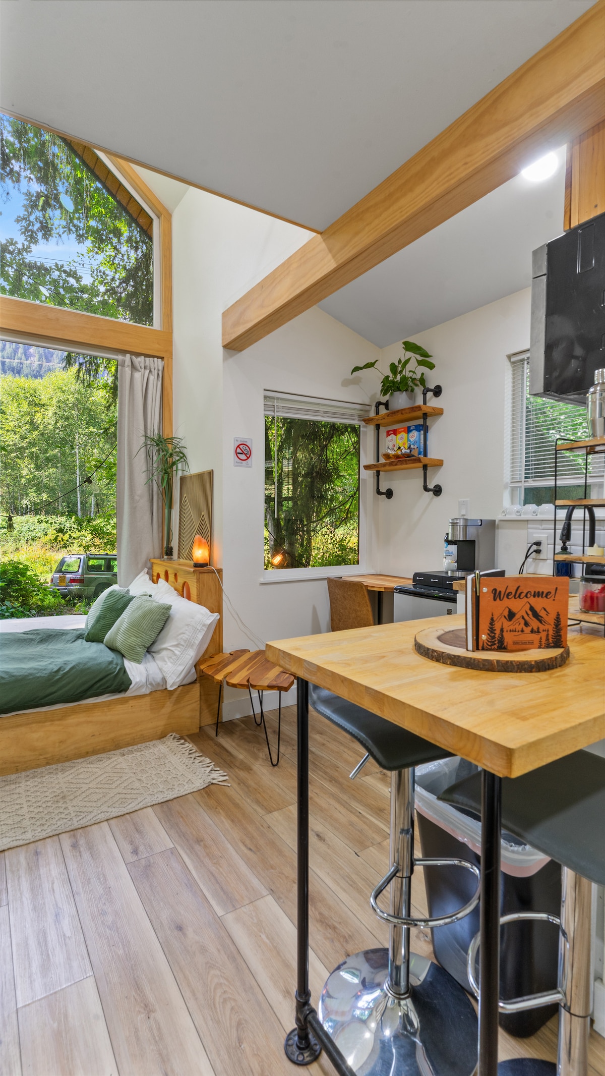 Welcome to our tiny guesthouse with an amazing view of Mt. Si. The property has great natural beauty yet is close to restaurants, coffee shops, breweries, groceries, hiking & biking trails, golf courses, and a casino. It's the perfect getaway only 29 miles from Seattle & 35 miles from Sea-Tac. Enjoy a dreamy king bed, electric fireplace, large TV, heated floors, and creekside patio with a view to the forest, garden and Koi pond. The majestic view moves at the pace of the changing seasons.