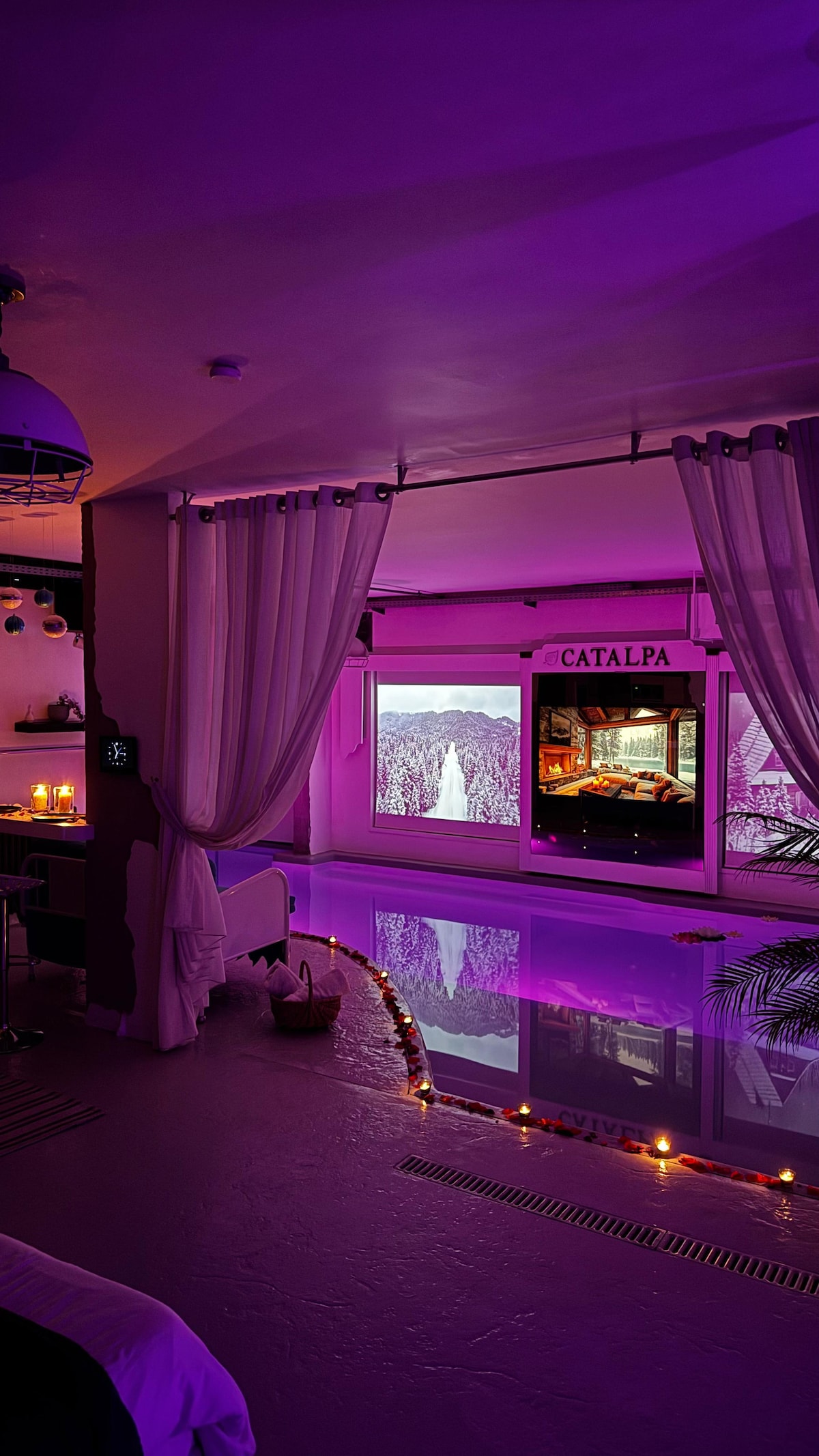 Catalpa Guesthouse is a luxurious and stylish accommodation, featuring the Ovata Suite - an industrial and luxurious masterpiece. It comes with a private indoor pool equipped with a cinematic TV, waterfall and jacuzzi bubbles . The suite is fully automated with a fingerprint door lock and offers breathtaking mountain views during sunset. The outdoor pool and bar area is surrounded by a beautiful garden with organic plants and trees.