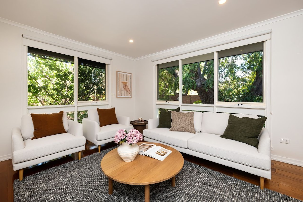 Relax in this beach-inspired Stay very conveniently located, to explore the Mornington Peninsula. Walk to the beach, station, shops, and restaurants. Enjoy the morning sun, stroll along Frankston Beach, and unwind in a cottage garden. 50 meters away offers stunning sunset views, while bushwalks, art venues, and coastal attractions are just moments away. The perfect mix of nature, comfort, and convenience.