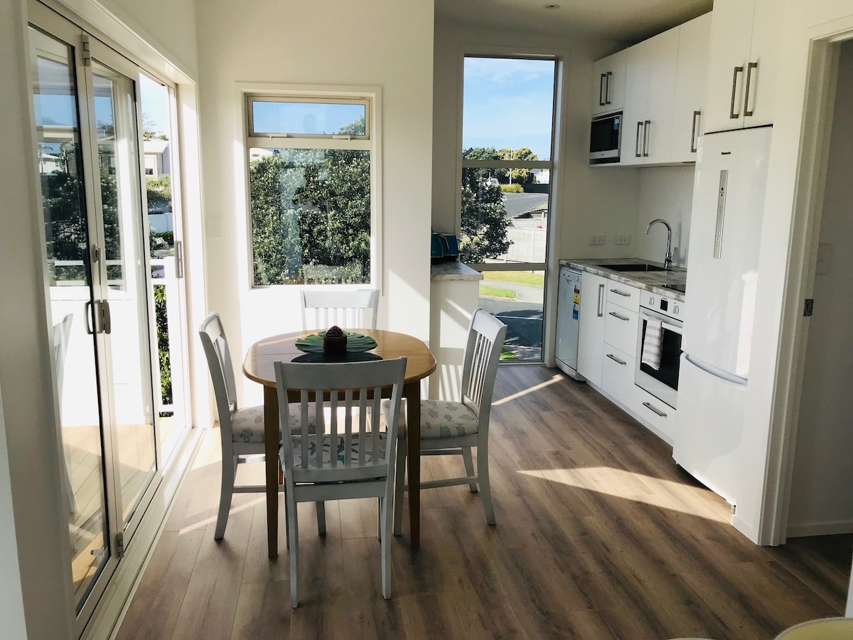Stylish, light-filled studio in a quiet cul-de-sac, just minutes from Papamoa Beach 🏝️. Relax in a comfy queen bed with luxe linen, enjoy a modern bathroom, aircon, 42" smart TV, and a well-equipped kitchenette with cereal, coffee & treats. A futon sofa converts to a double bed for extra guests. Work with fast Wi-Fi, unwind on your private grassy lawn, or stroll to the sand. Safe off-street parking makes arrival easy. You’ll find everything you need to relax, recharge, and feel at home.