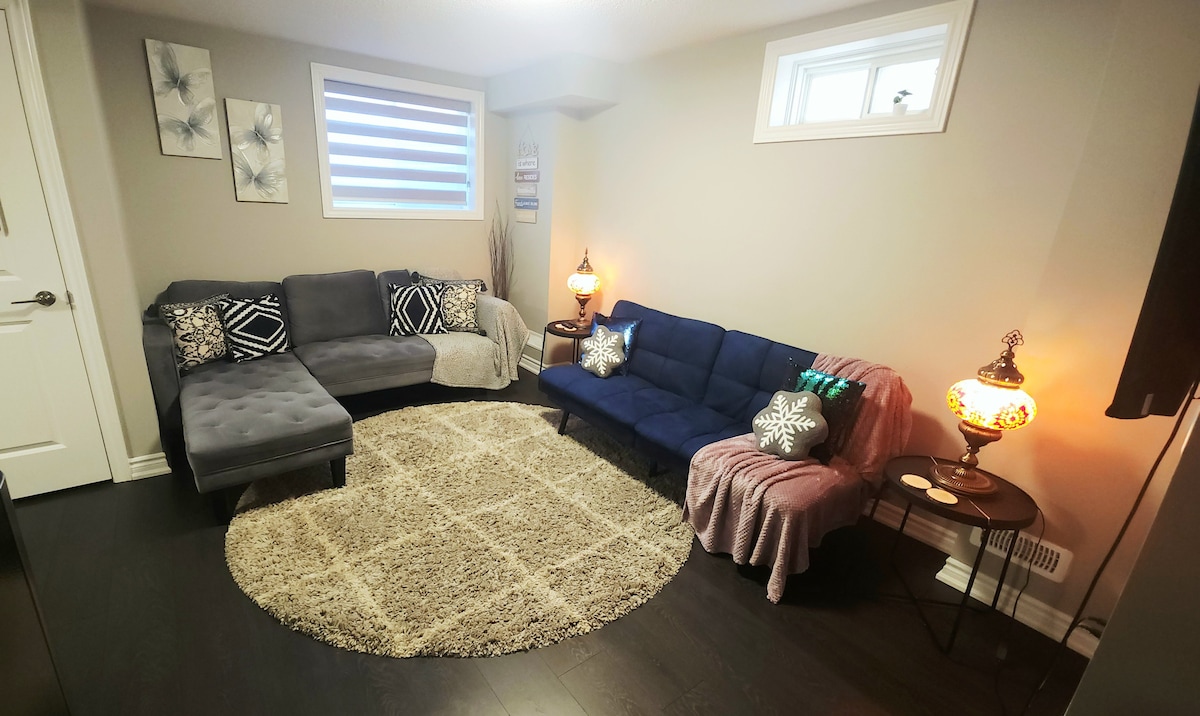 Welcome to our cozy basement apartment! This modern Airbnb is located in a peaceful residential neighborhood 40 min drive from Toronto downtown and an hour from Niagara Falls. The well-lit space features a comfortable queen-sized bed, ample storage in the spacious closet, and a beautifully designed interior with natural light flooding through large windows. Note: We have 2 single folding matresses available to place on the floor in the living room. Extra linen and pillows are provided.