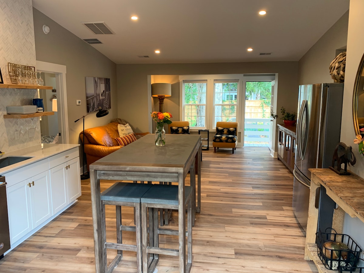 This newly built carriage house is separate from the main house. The cottage is about 1,200 sqft so it very open and spacious and great views of marsh and our tidal creek. We have a separate work area with desk and a massive dinning table if you need more room to work or to gather with friends. Full kitchen, washer and dryer, massive shower, the list goes on. You may not want to leave! Feel free to go sit and have coffee or cocktails on the dock. PERMIT# OP2025-06925
