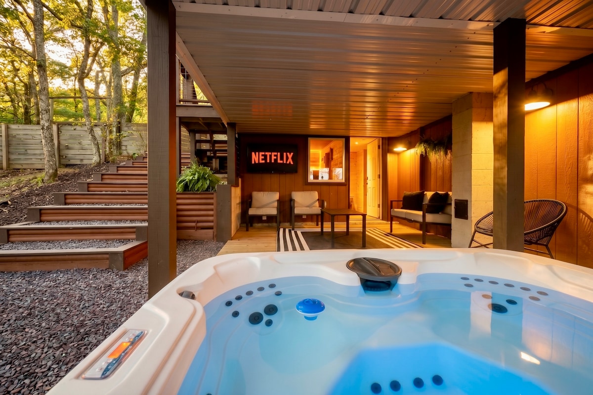 全新!现代小木屋|热水浴缸、火坑、乡村俱乐部