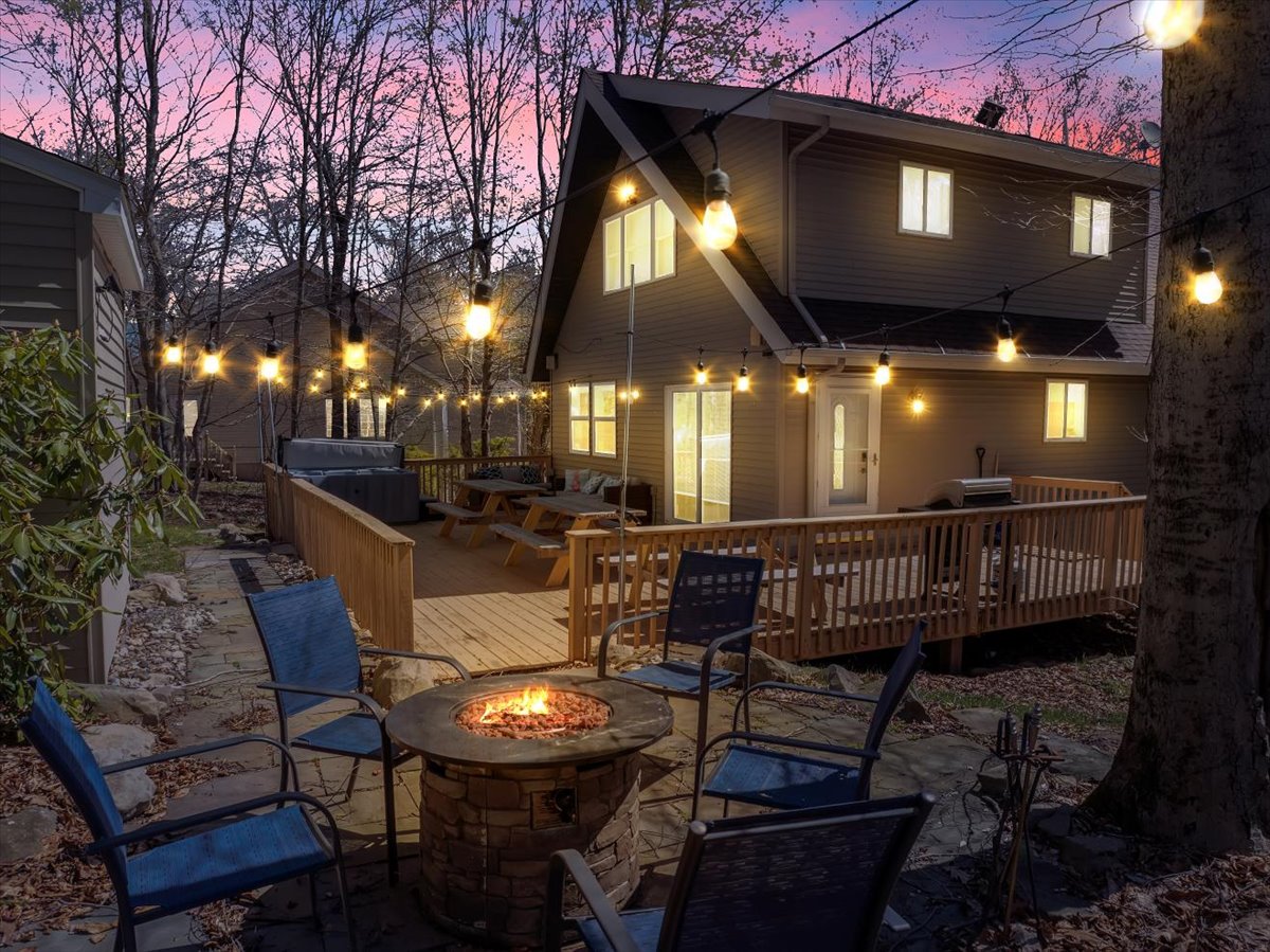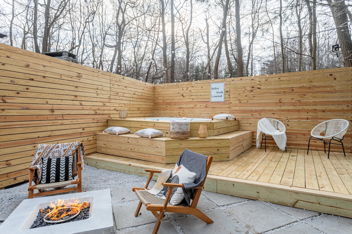 Relax and unwind at this stunning Poconos vacation property. Melt your troubles away with a dip in the hot tub or experience our custom-built Finnish-style sauna. This property has been thoughtfully remodeled throughout with warm wood floors, hand crafted ceramic tiles, extra comfortable beds, and custom artistic details, creating a truly unique and luxurious feel. Relax in the spa-like bathroom, sit by the firepit, or enjoy the lakes, pools, tennis courts or other amenities in the community.
