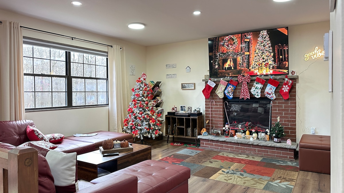 Escape to a cozy fall getaway near Kalahari, Mount Airy Casino, Crossings Outlets, Lake Wallenpaupack, & Tobyhanna State Park 2 miles away w/ fall foliage, & mountain air, lake views, wildlife, & picnic spots. Nestled off a rugged private road. This spa style retreat has a soaking tub, rain shower, smart lights, kitchen w/ smart stove, plush beds, LED mirrors w/ music sync, & retro arcade fun. Perfect for couples, birthday getaways or families seeking a peaceful Poconos stay w/ modern amenities.