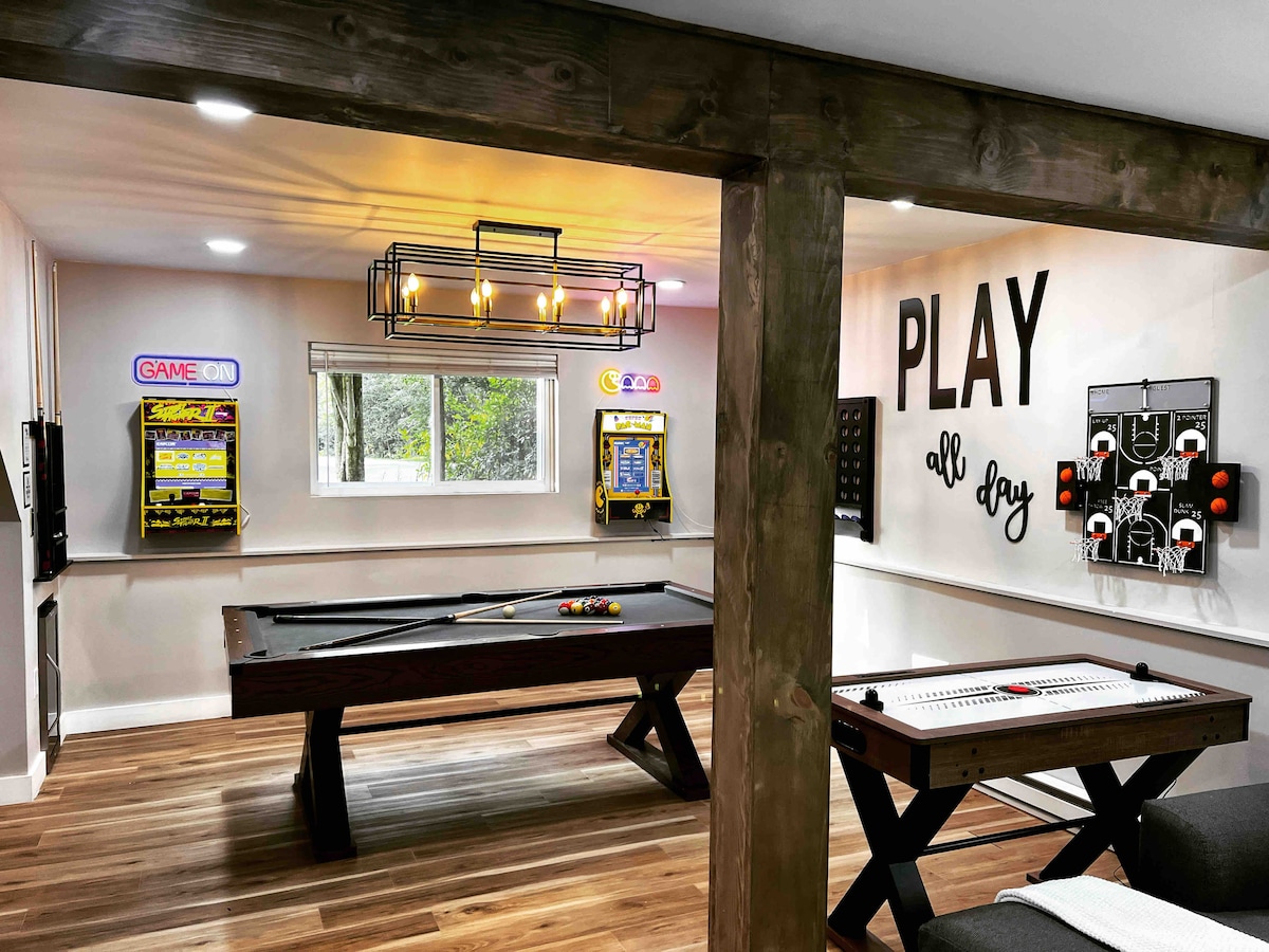 Escape to a cozy fall getaway near Kalahari, Mount Airy Casino, Crossings Outlets, Lake Wallenpaupack, & Tobyhanna State Park 2 miles away w/ fall foliage, & mountain air, lake views, wildlife, & picnic spots. Nestled off a rugged private road. This spa style retreat has a soaking tub, rain shower, smart lights, kitchen w/ smart stove, plush beds, LED mirrors w/ music sync, & retro arcade fun. Perfect for couples, birthday getaways or families seeking a peaceful Poconos stay w/ modern amenities.
