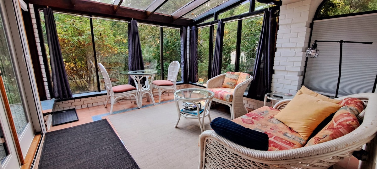 Welcome to our cozy, art-filled studio in Duncan, Cowichan Valley. Whether you're here to relax or explore, it's the perfect home base. The suite is beside our home, with full privacy. Enjoy a deck, hammock, and year-round private hot tub. Inside, full-equipped kitchen with granite counters, a propane range, and a bar fridge. It sleeps four with a queen Murphy bed and a queen loft bed, both with organic sheets. Stay comfortable with radiant floor heating, a rustic fireplace, and AC for summer.