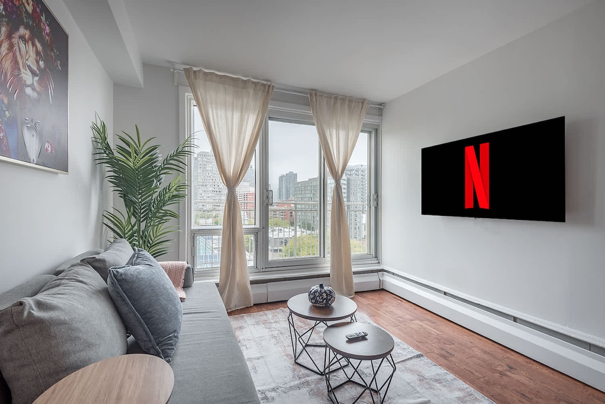 Enjoy your stay in the heart of the city ! Brand new TDC 2 downtown luxury with direct Bell Center access! Revel in comfort in our fully furnished and equipped one-bedroom condo with own private balcony! Your stay includes access to a sauna, pool, gym, skylounge, gaming room, lounge, and terrace with multiple barbecues. Free underground parking, with the subway just minutes away. Without stepping outside, the city is yours to explore. Plus, unwind with complimentary Netflix for the perfect stay