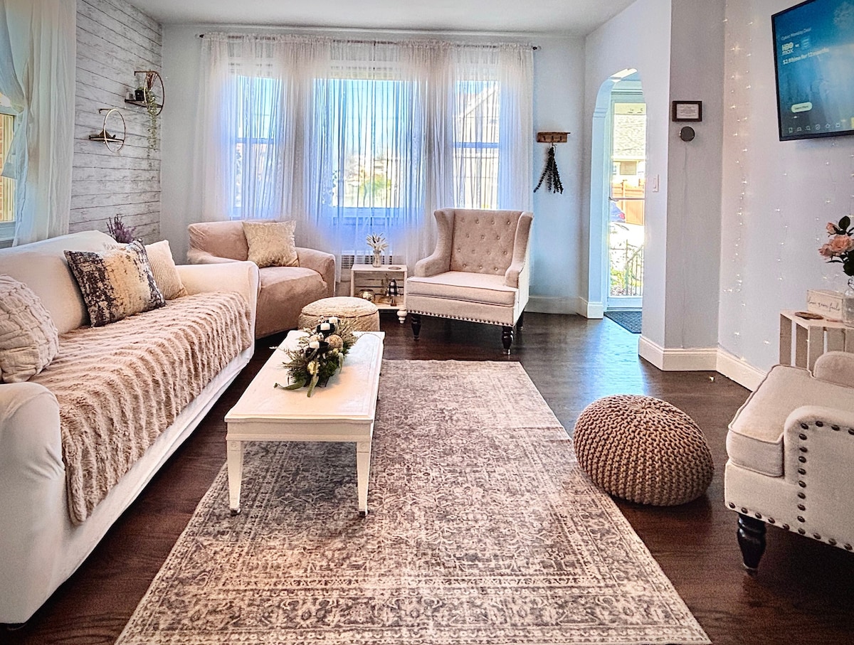 This meticulously curated Japandi-inspired studio is perfect for remote work or a peaceful retreat. The space features a cozy queen bed, small loveseat, and seating area. Enjoy high-speed internet, TV, and a writing desk for productivity. The suite includes a kitchenette with a fridge, microwave, and coffee maker. Located in a quiet, safe neighborhood, with access to a backyard fire pit for relaxation. Ideal for a calm, comfortable, and productive stay.
