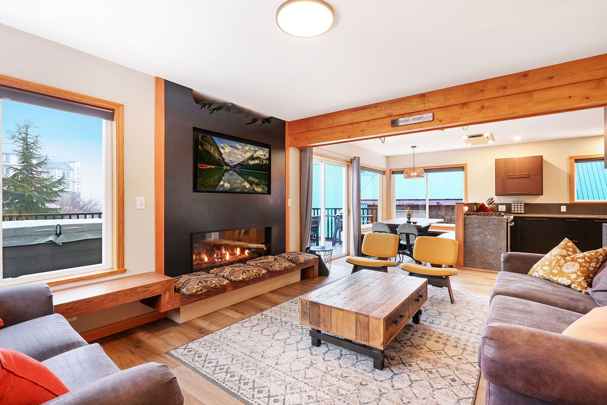 Beautiful 3 bedroom condo with sauna, overlooking the Alpine Village. Watch the sun rise and set from the front deck. Enjoy a 3 minute walk to the Pub, in the winter ski in ski out from your door to the chair lift in the summer bike, hike or jog down to Strathcona Park or up to the chair lift for a sightseeing adventure. Relax and Enjoy all the Mt. Has to offer. Ski in ski out means no road access till summer.