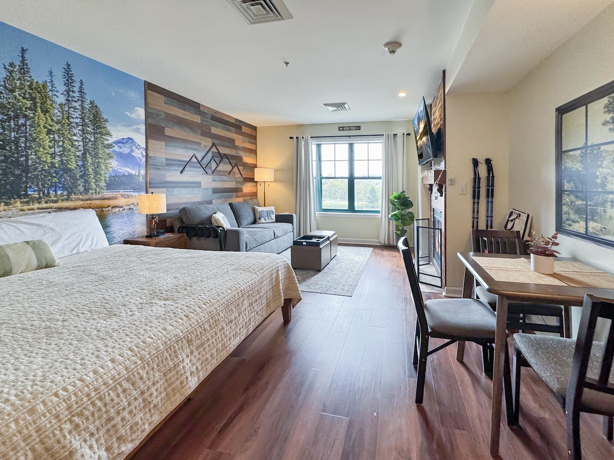 The whole group will be comfortable in this spacious and unique space. This is a limited oversized 1 Bedroom Suite. Only a handful of the one hundred or so 1 bedroom units in the building are an oversized suite, and this is one! This unit will accommodate 6 people total if desired. Plenty of room to move around. Fully stocked and ready for your next adventure, work travel, family vacation or romantic weekend! This is a 4 season resort with a 4 season outdoor pool, hot tubs and sauna.