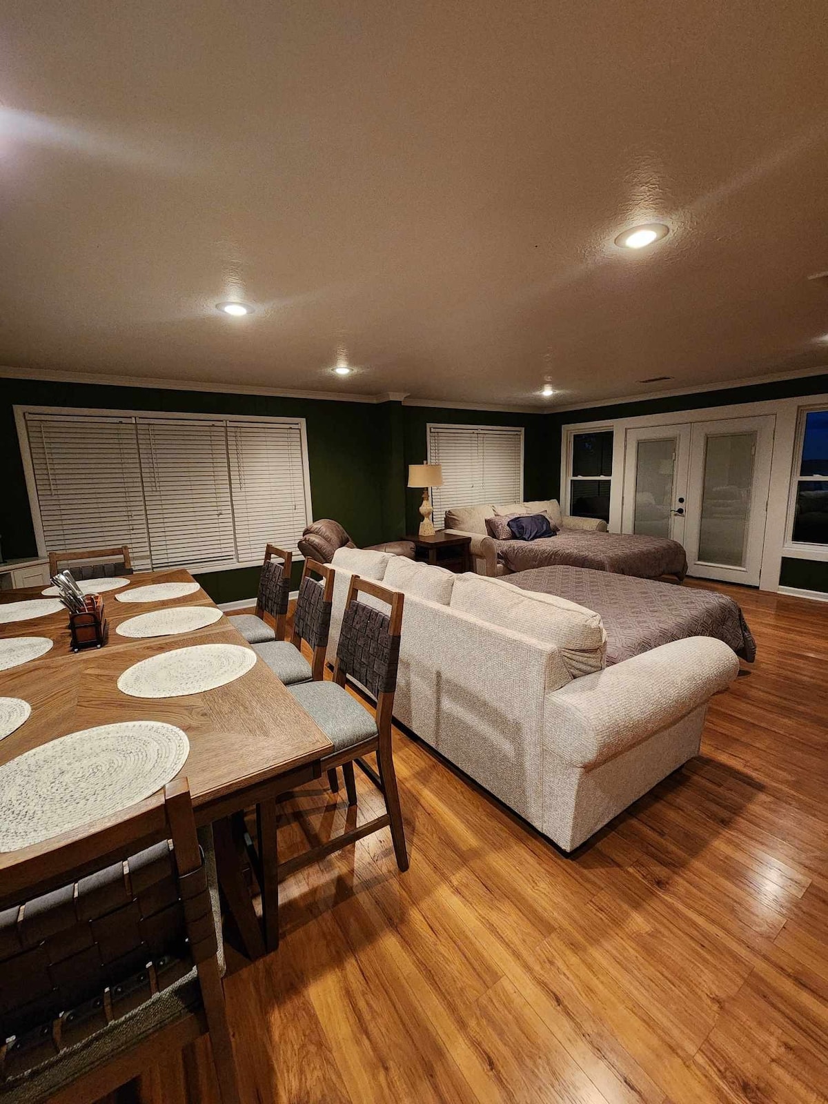Surrounded by nature, this home has a huge back patio and pool deck/ grilling area that faces the forest and sunset, great for entertaining. A four minute drive from the Bull Shoals White River State Park, guests have easy access to fishing and boating in the beautiful river. Local restaurant Gastons is just down the road, as well as multiple nearby small towns for all your shopping and dining needs. End the day relaxing in the master bathtub or in the recliners by the fireplace.